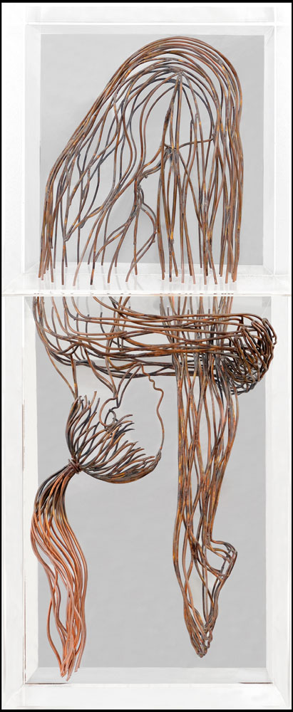 scultura in filo di rame modellata e saldata a mano, applicata su lastra specchiante e inserita in teca di plexiglass composta da due elementi cm.45x45x20 cadauno, firma e anno al retro di ognuna, certificato dell'artista su foto.