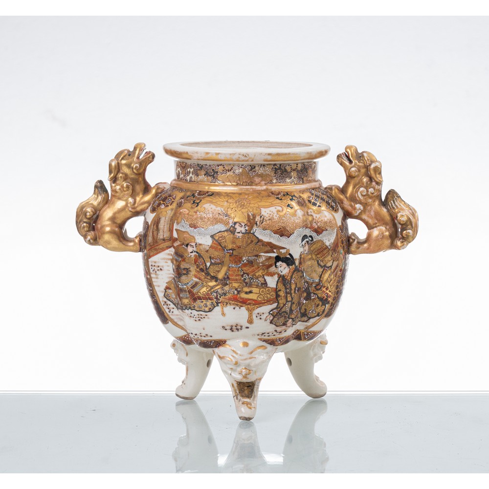 Vaso Satsuma in ceramica decorata e dipinta raffigurante "Scena di vita" con lumeggiature in oro.