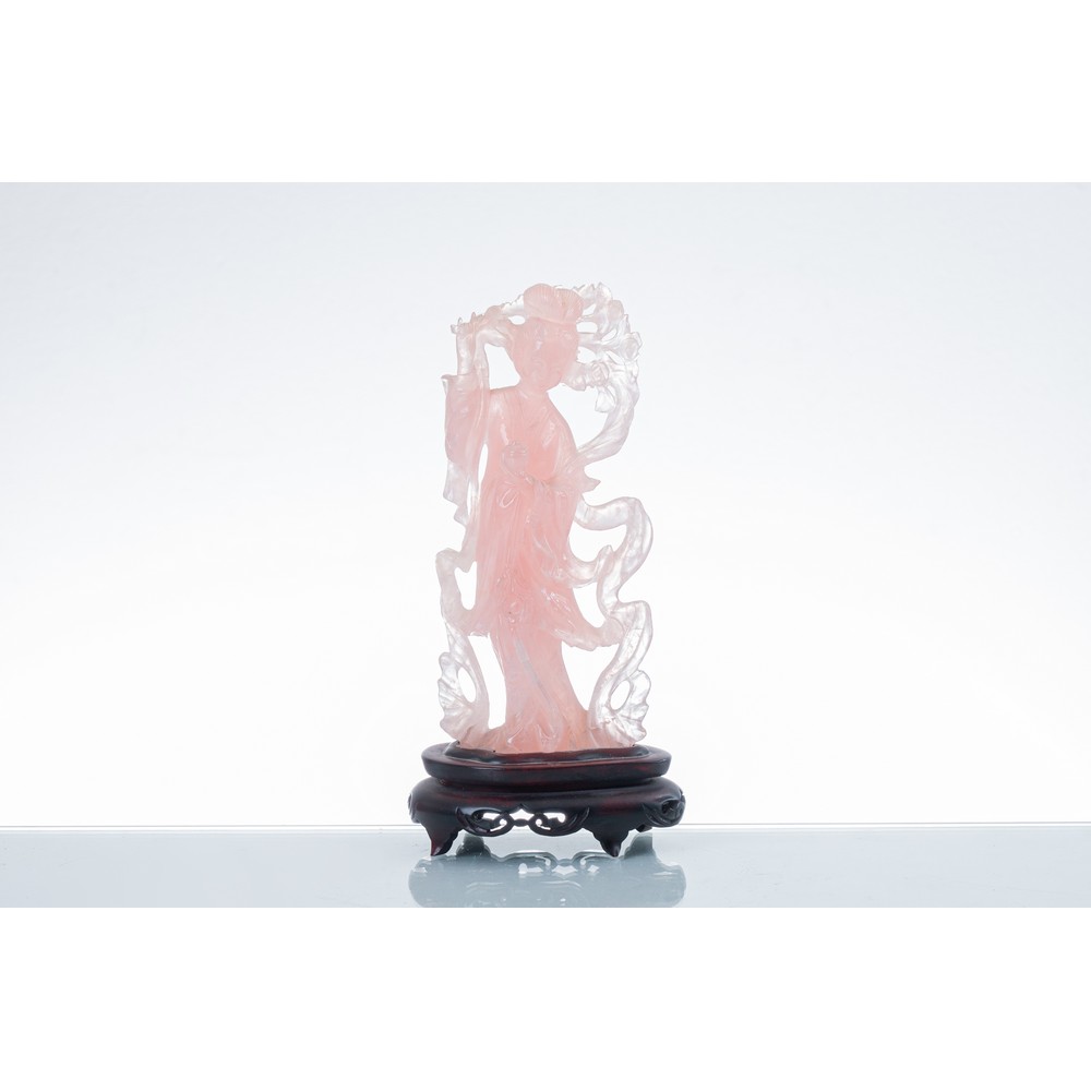 Scultura in quarzo rosa raffigurante "Geisha", base in legno ebanizzato (usure).
