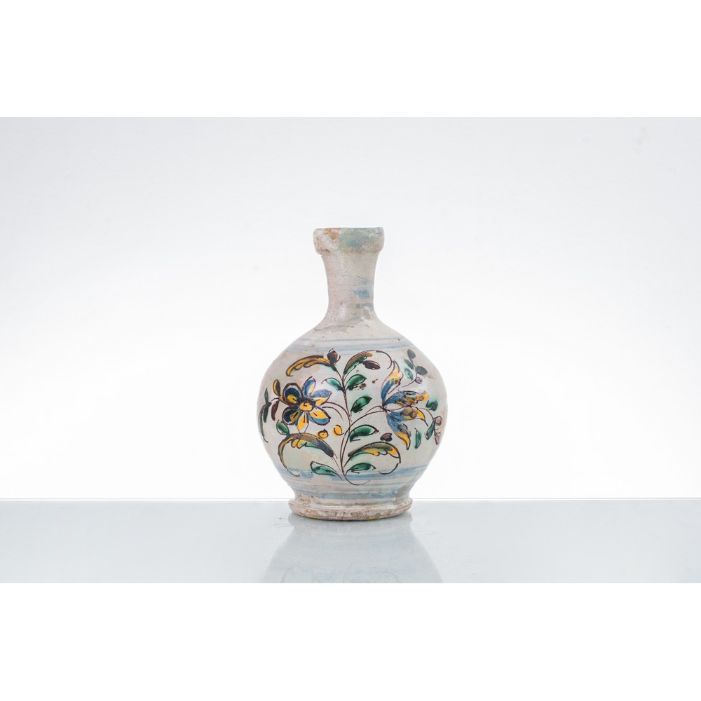 Bottiglia in ceramica decorata e dipinta a motivo floreale e fogliaceo (restauri).