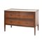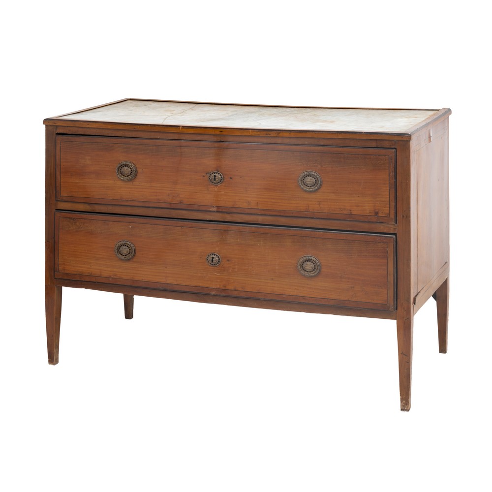 Cassettone Luigi XVI in legno di ciliegio, perfili in legno esotico, maniglie in bronzo, marmo bianco incassato (filatura).