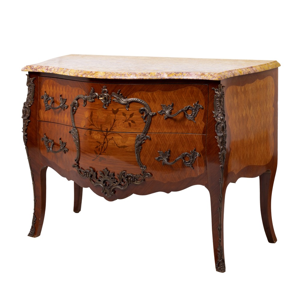 Cassettone stile Luigi XV in legno di noce e bois de rose, guarniture in bronzo, piano in marmo rosa venato.