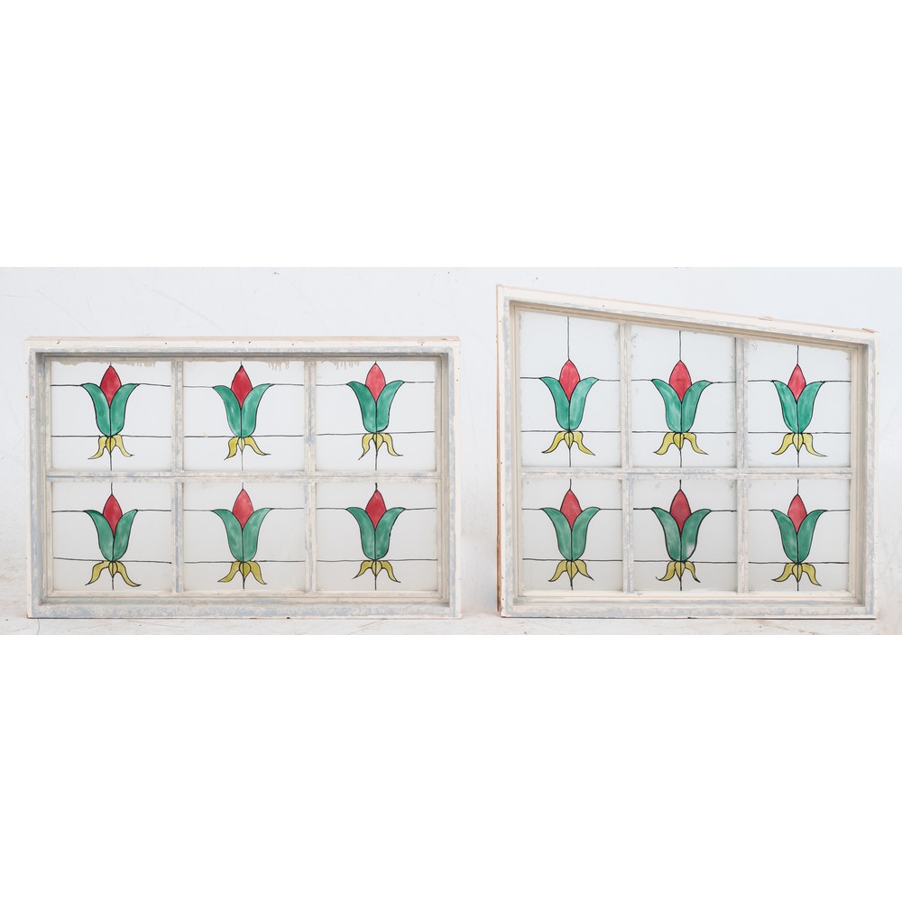 Due finestre in legno con vetri dipinti tipo cattedrale.
