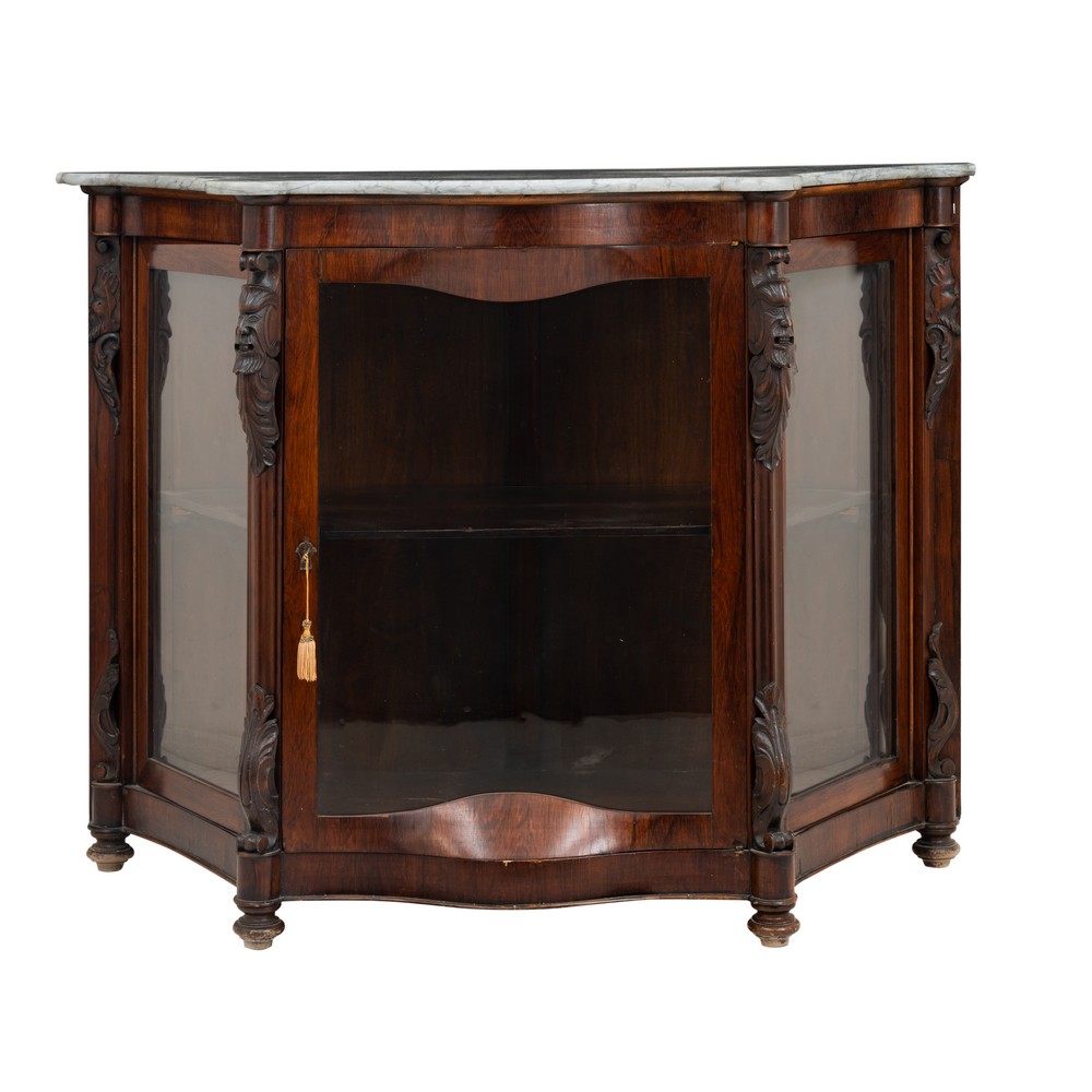 Etagere Luigi Filippo di forma scantonata ad un'anta in legno di mogano, piano in marmo grigio venato.