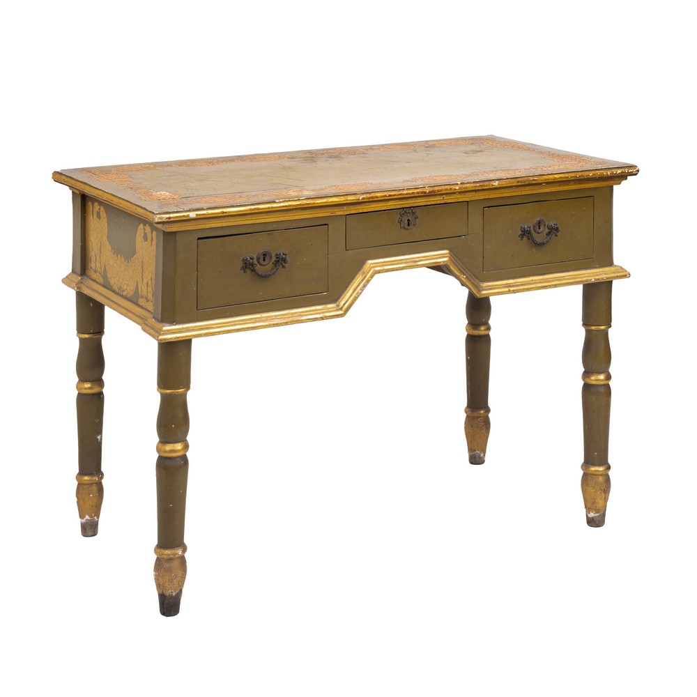 Scrittoio da centro a tre cassetti in legno laccato e dorato, intarsio sul piano raffigurante "Stemma nobiliare".