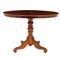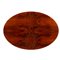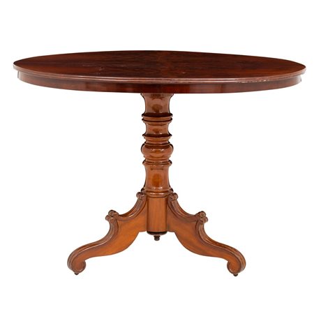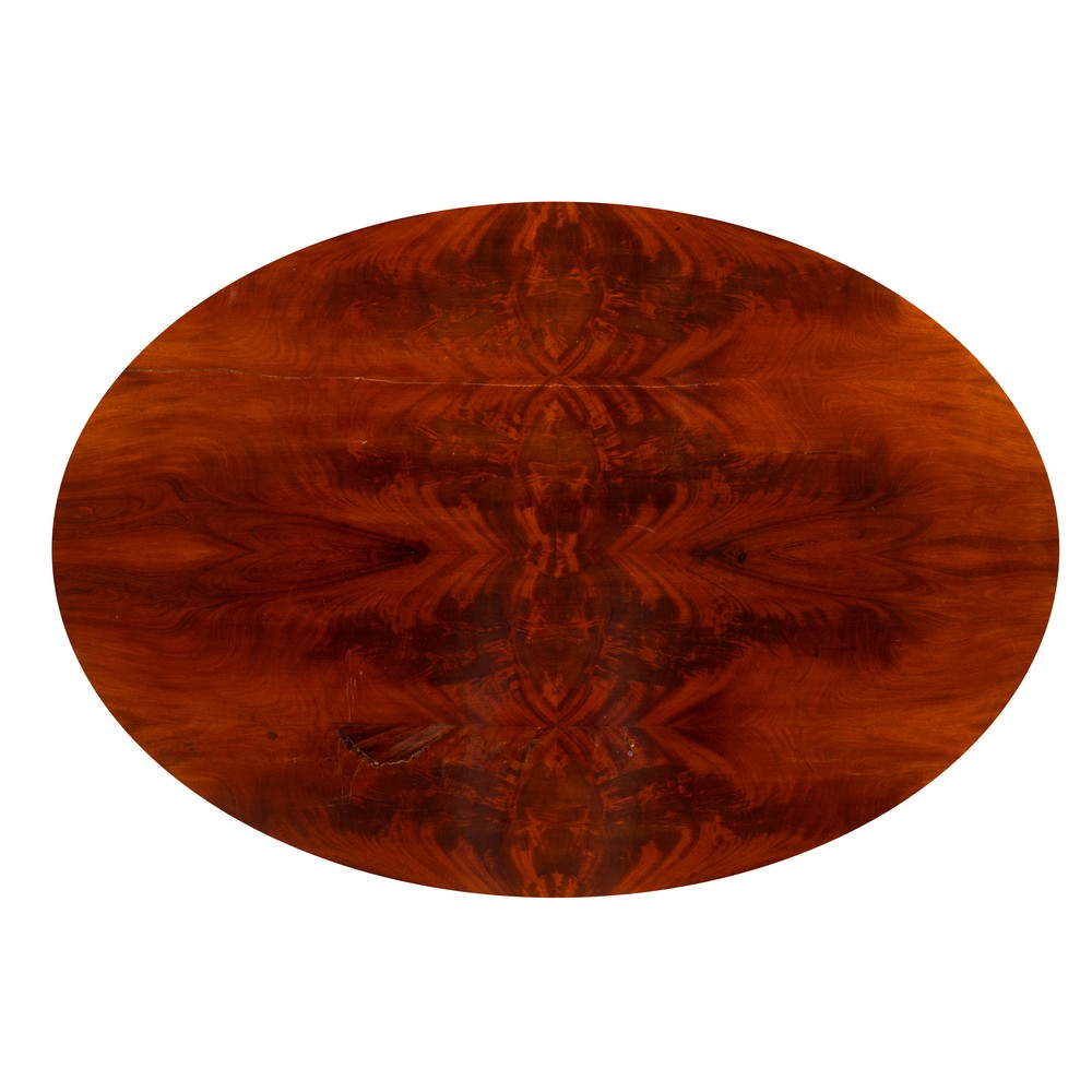 Tavolino Luigi Filippo di forma ovale in legno di mogano e piuma di mogano, fusto a colonna e piede tripode.
