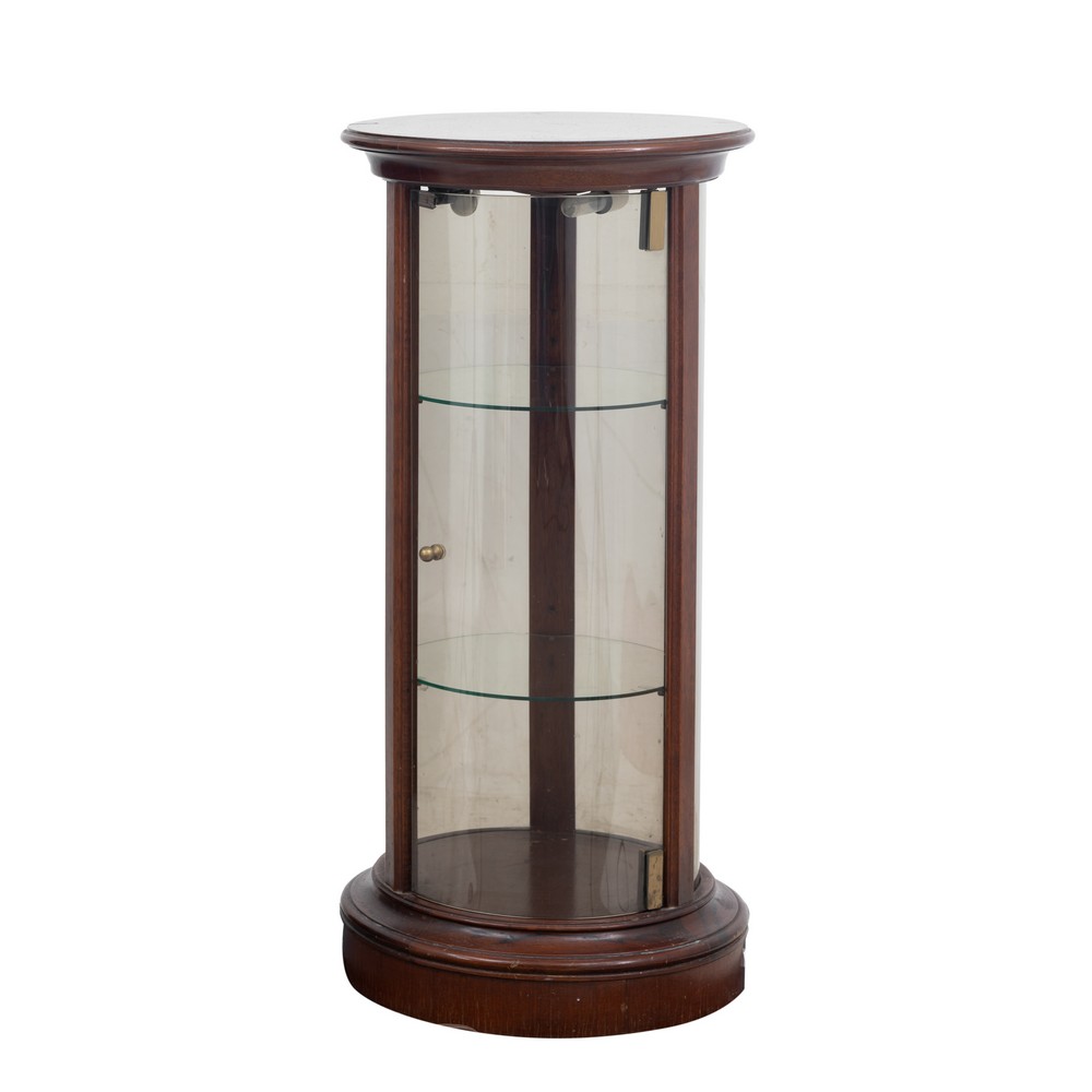 Bacheca a giorno di forma cilindrica in legno di mogano (usure e difetti).