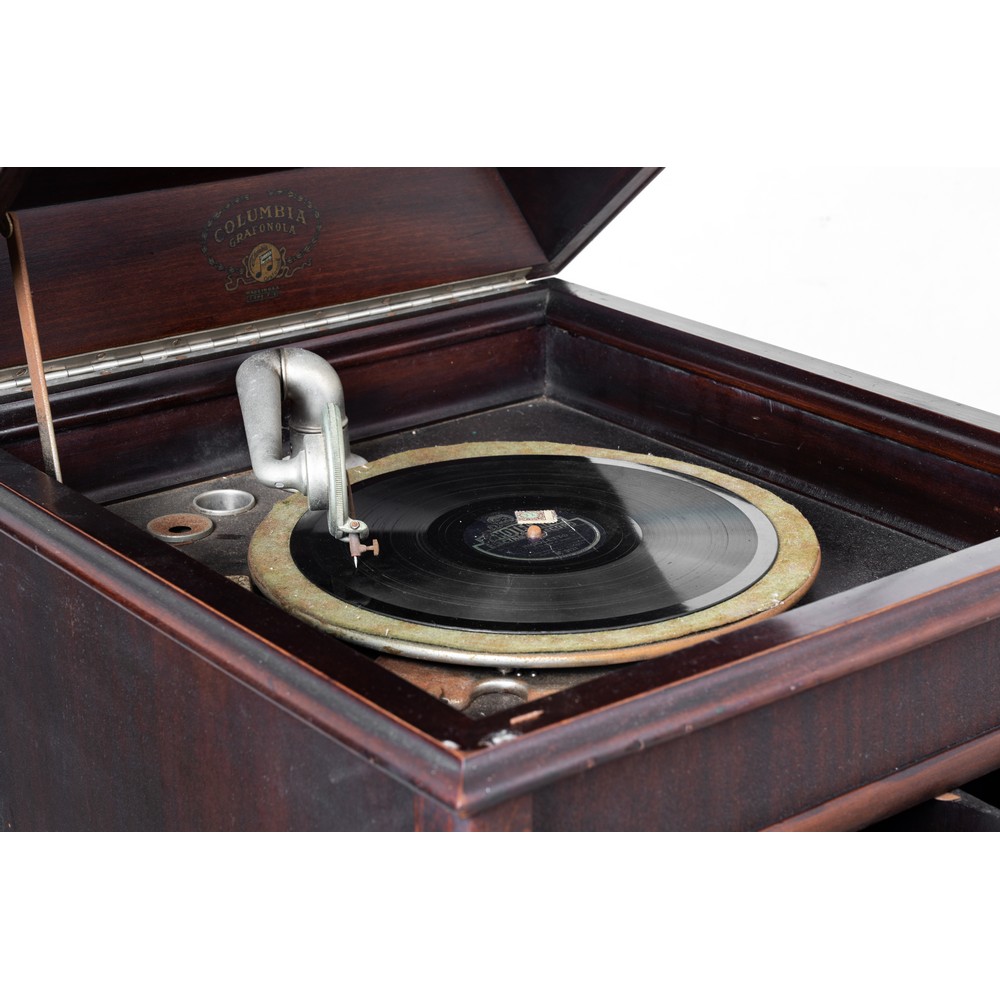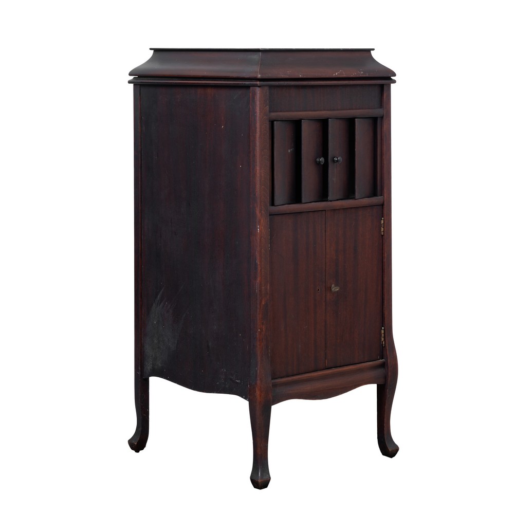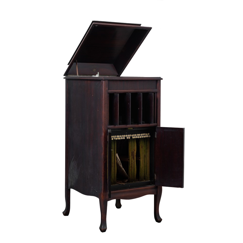 Mobile grammofono "Columbia Grafonola" in legno di mogano con sportello portadischi.