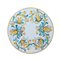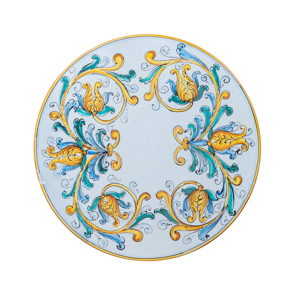 Tavolino con piano in ceramica smaltata e decorata, base in ferro.