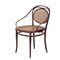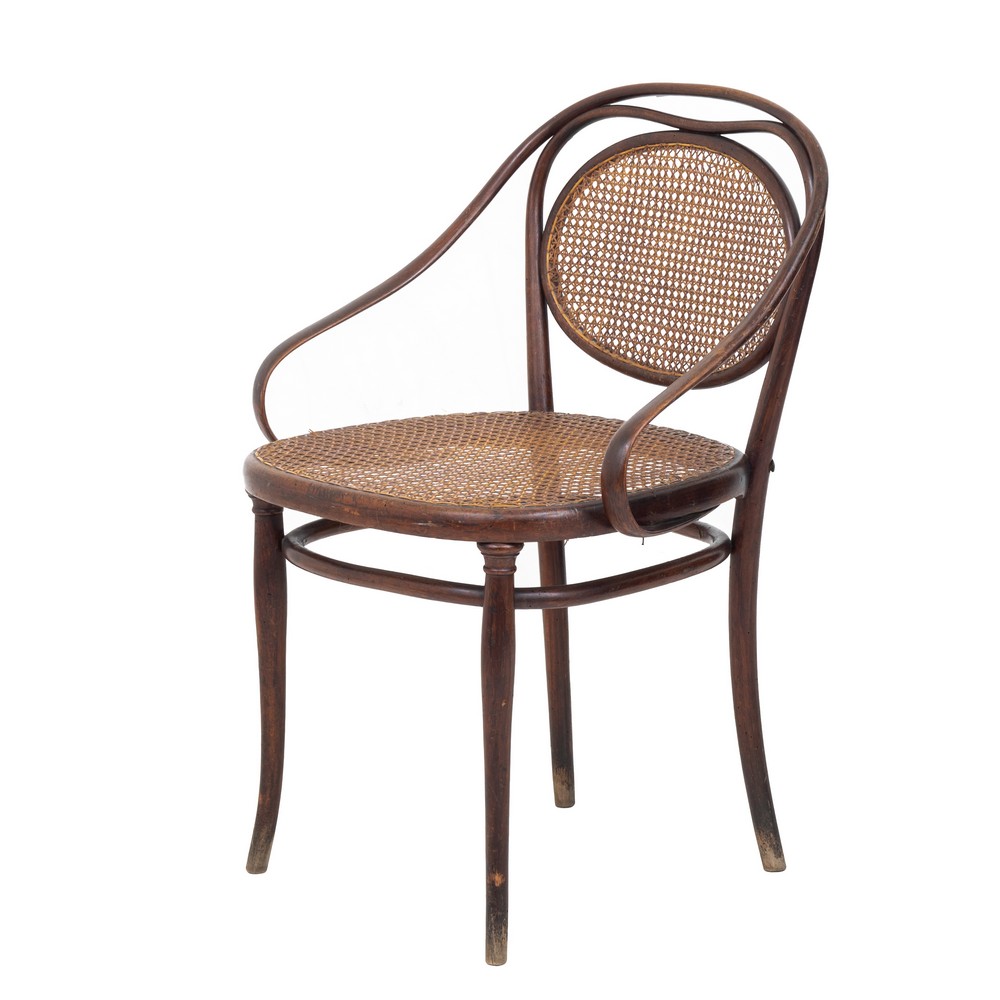 Piccola poltrona stile thonet in legno di faggio curvato a fuoco, seduta in finocchino.