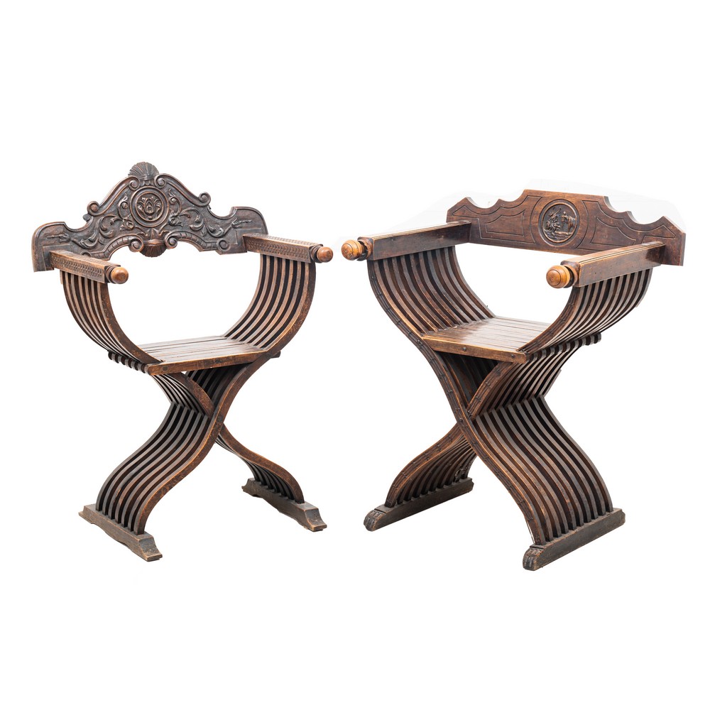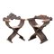 Coppia di poltrone a savonarola stile rinascimentale in legno di noce.