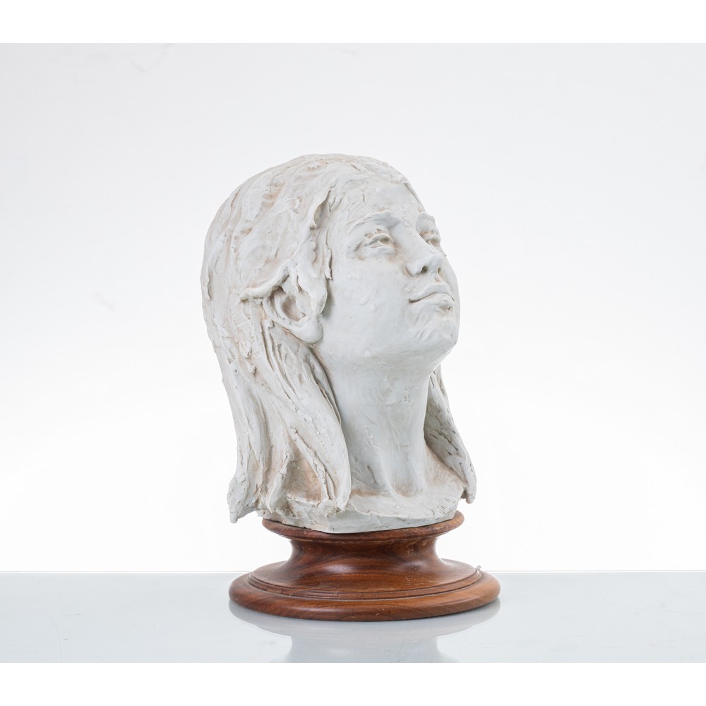 Scultura in biscuit raffigurante "Volto di donna" con base in legno. Sul retro riporta "George".