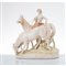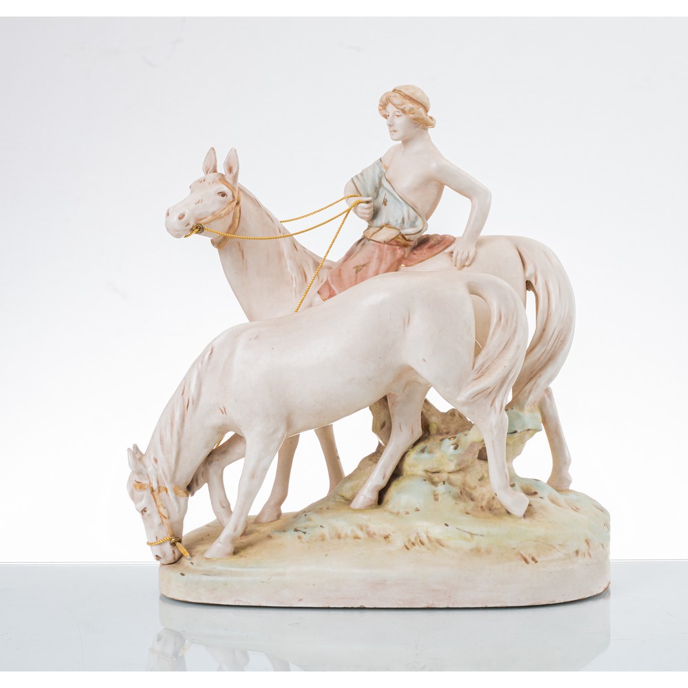 Gruppo in biscuit policromo raffigurante "Figura neoclassica con cavalli".