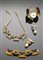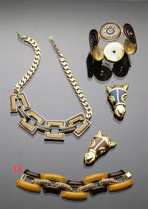 LANCETTI Bracciale dorato a grandi maglie smaltate marrone e giallo senape collegate tra di loro da pavè di Swarowski, anni '80 Cm 19 1980's gold colored with large brown and yellow colored enameled segments connected with Swarovski pavé