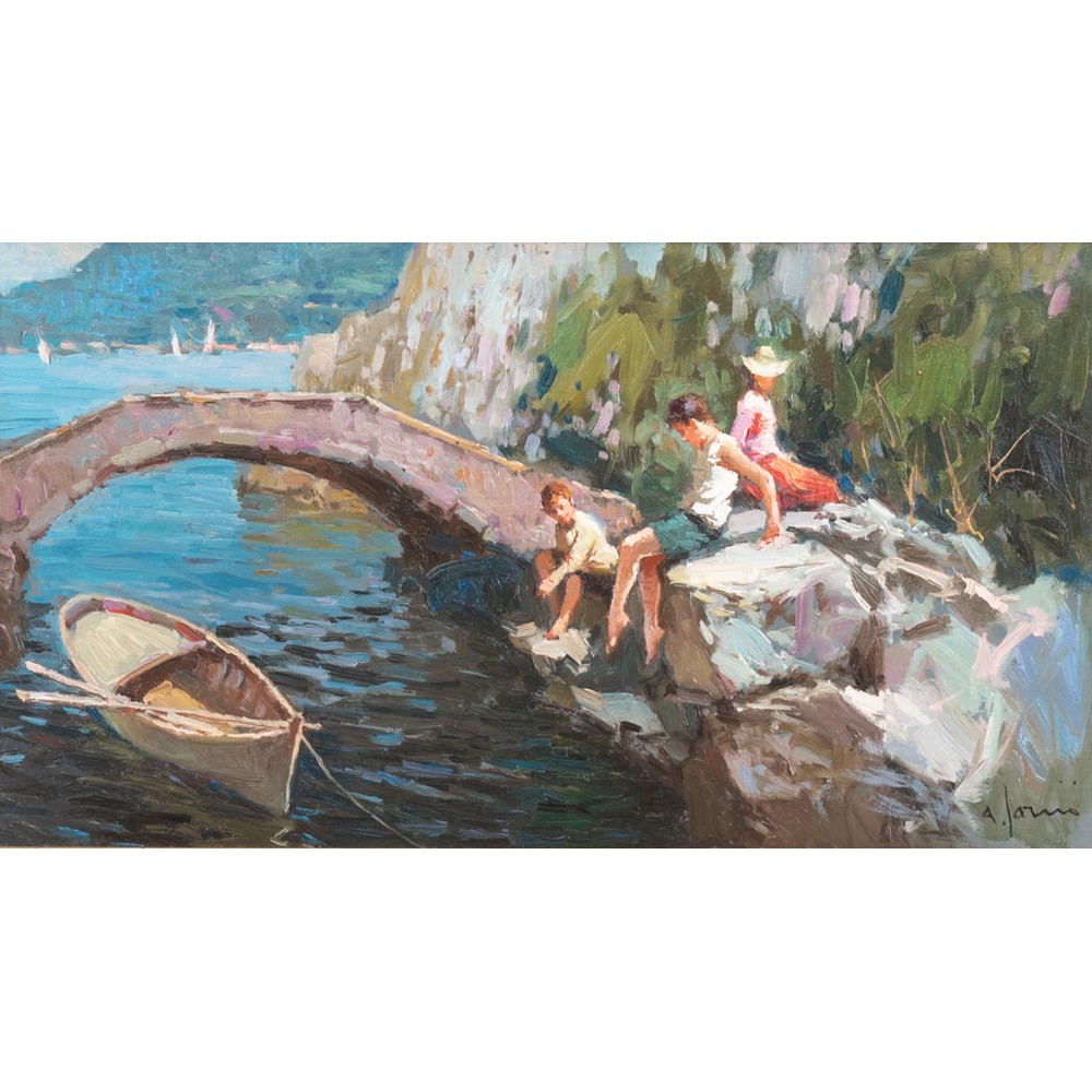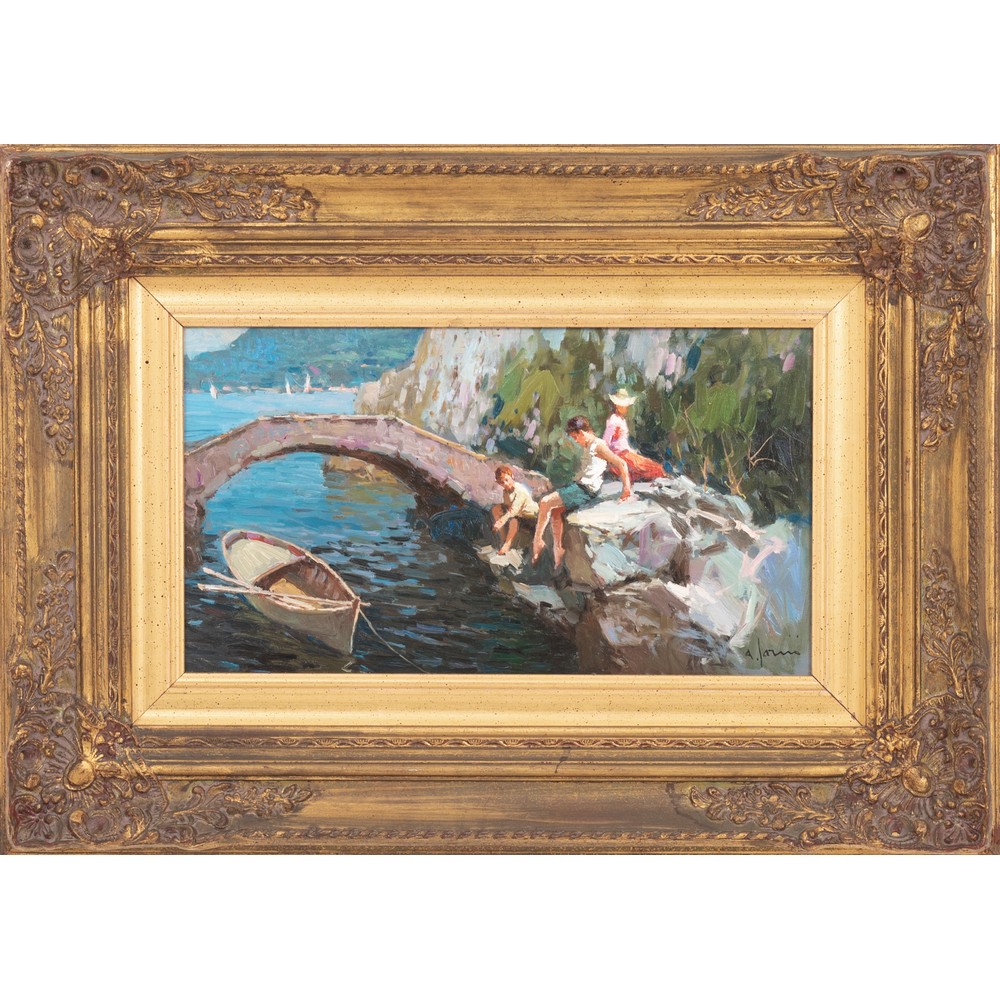 Paesaggio costiero con ponte e personaggi