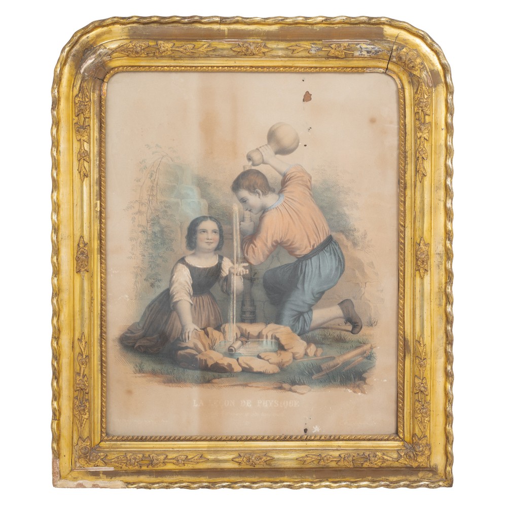 Cornice in legno e pastiglia dorata ad argento a mecca, all'interno incisione a colori "La leçon de physique".