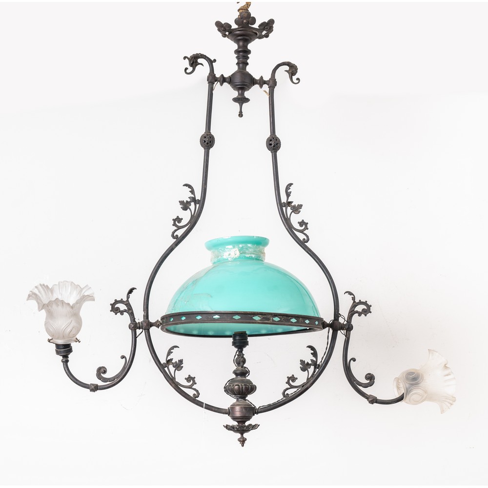 Lampadario in metallo brunito a tre luci con boccia centrale in opaline verde e due bocce in vetro satinato (filatura alla boccia centrale).