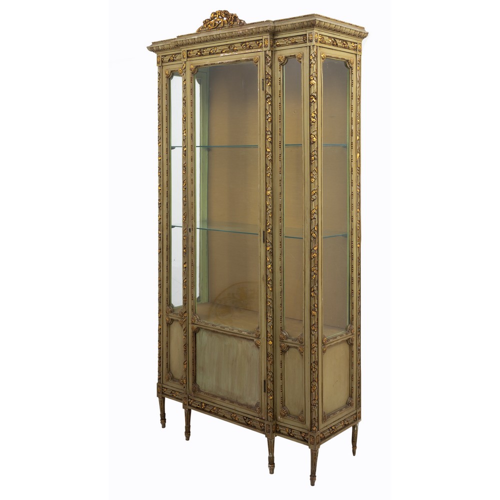 Vetrina ad un'anta a giorno stile Luigi XVI in legno laccato e dorato.