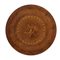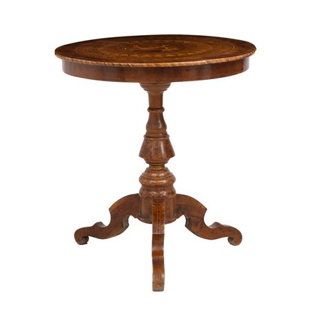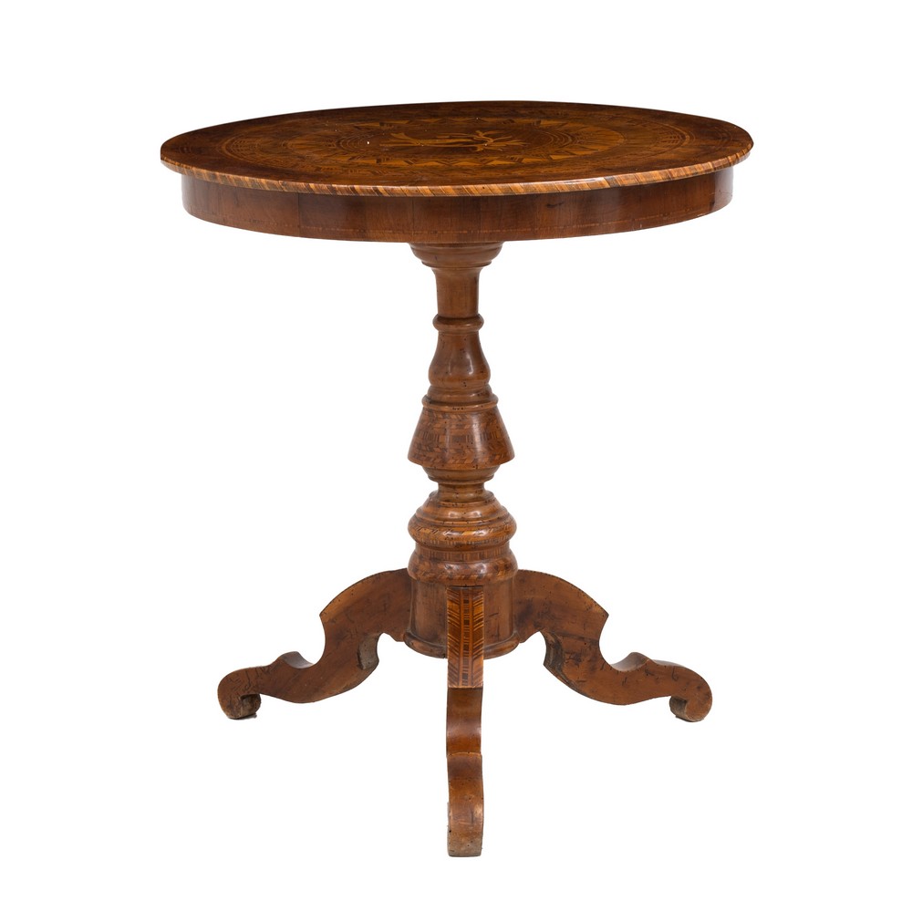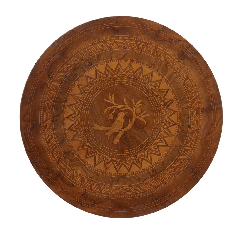 Tavolino sorrentino in legno di noce, tarsie in legno di bosso a motivo geometrico, disegno al centro raffigurante "Ramo con volatile".