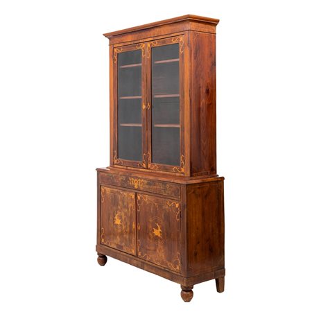 Libreria doppio corpo Carlo X con due ante nella parte sottostante, due ante a vetri nella parte sovrastante in legno di mogano e piuma di mogano, tarsie in bosso.