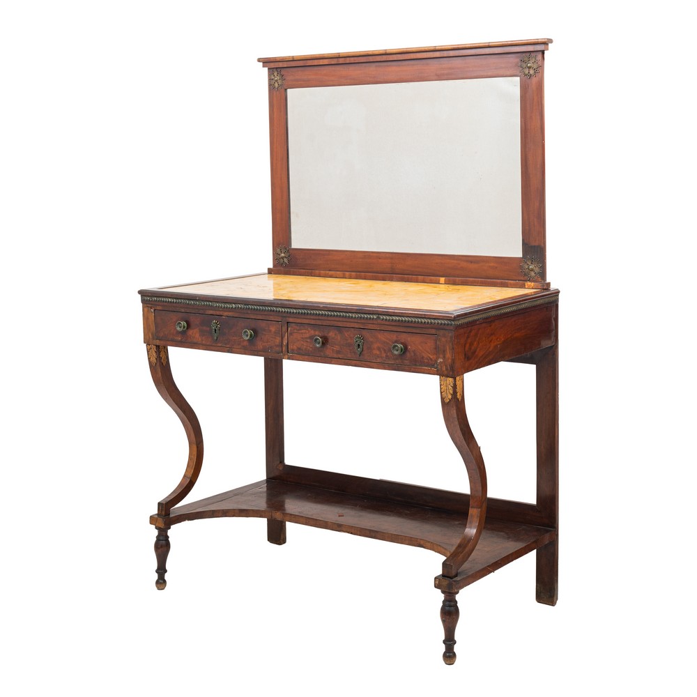 Consolle con specchiera periodo Impero in legno di mogano e piuma di mogano, fregi ed applicazioni in bronzo dorato, due cassetti, piano incassato in marmo giallo venato.