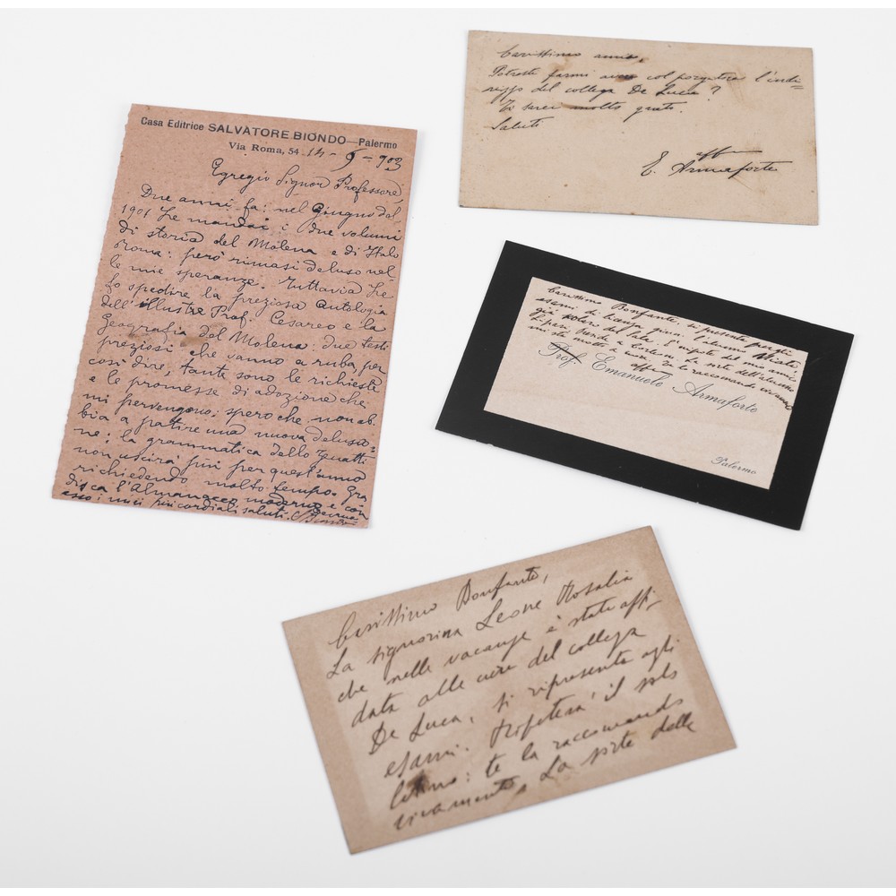 QUATTRO BIGLIETTI AUTGRAFI: 1) Tre biglietti da visita autografi del Prof. Emanuele Armaforte. Latinista, traduttore, poeta di gusto classico, nato ad Altofonte (PA) il 25 dicembre 1870 e morto a Brooklyn (U.S.A.) il 26 dicembre 1926. A lui sono dedicate una via a Palermo ed un istituto scolastico ad Altofonte. 2) Biglietto autografo su carta intestata di Salvatore Biondo, imprenditore, libraio e proprietario della omonima casa editrice. Fu il padre dei fratelli Biondo fondatori del teatro palermitano che tutt’oggi porta il loro nome.