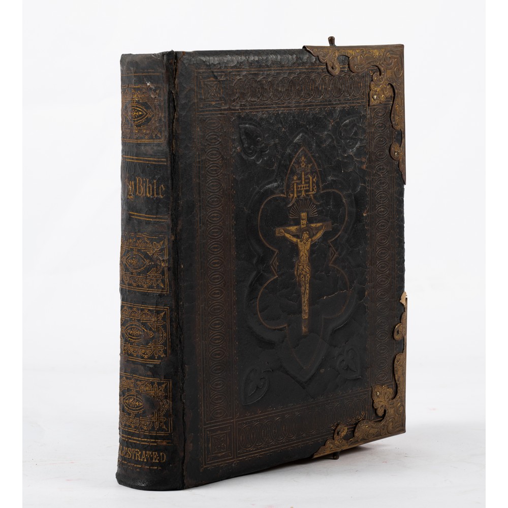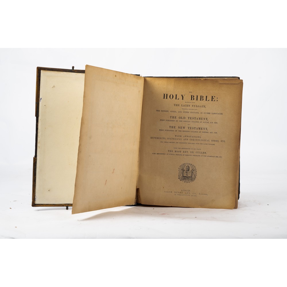 Paul Cullen THE HOLY BIBLE TRANSLATED FROM THE LATIN VULGATE, DILIGENTLY COMPARED WITH THE HEBREW, GREEK, AND OTHER EDITIONS IN DIVERS LANGUAGES. THE OLD TESTAMENT, FIRST PUBLISHED BY THE ENGLISH COLLEGE AT DOUAY, A. D. 1609 AND THE NEW TESTAMENT FIRST PUBLISHED BY THE ENGLISH COLLEGE AT RHEIMS, A. D. 1582. WITH ANNOTATIONS, REFERENCES, HISTORICAL AND CHRONOLOGICAL INDEX, ETC….. ed. James Duffy & Co, Dublin, 1865. Legatura editoriale in pelle nera finemente lavorata e dorata ai piatti e al dorso. Tagli dorati. Cantonali in bronzo di raffinata lavorazione ma fermagli assenti. Registro di famiglia finemente decorato. Incisione al frontespizio del Nuovo Testamento. Illustrato con tavole a piena pagina a colori e in b/n f. t. e molte illustrazioni in b/n nel testo. Pp. 764, 219, (4).