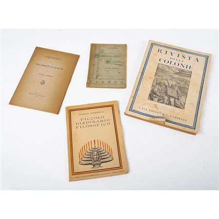QUATTRO OPUSCOLI DI VARIA DEI PRIMI DEL ‘900: 1) Emilio Morselli PICCOLO DIZIONARIO FILOSOFICO, ed. Carlo Signorelli, Milano 1952. In 16°. Brossura editoriale figurata marginosa e tagli marginosi. Volumetto in perfette condizioni. Pp. 104. 2) RIVISTA DELLE COLONIE, Anno XV, n. 5 1941 – XIX, Casa Editrice Cappelli. In 8°. Strappetto alla coperta anteriore. Per il resto pubblicazione in ottime condizioni. Brossura editoriale marginosa. Pp. a numerazioni continue 599 – 751, ( 6). 3) Carlo Monticelli SCHiOPPETTATE POETICHE, ed. Roma, Tipografia Operaia Romana 1904. In 16°. Brossura editoriale figurata. Volumetto in ottime condizioni. Pp. 56. 4) CATALOGO DEL MUSEO CIVICO DI FOLIGNO, ed. Foligno, Stabilimento Tipografico Artigianelli 1908. In 8° piccolo. Brossura editoriale figurata. Volumetto in ottime condizioni. Pp. 24.