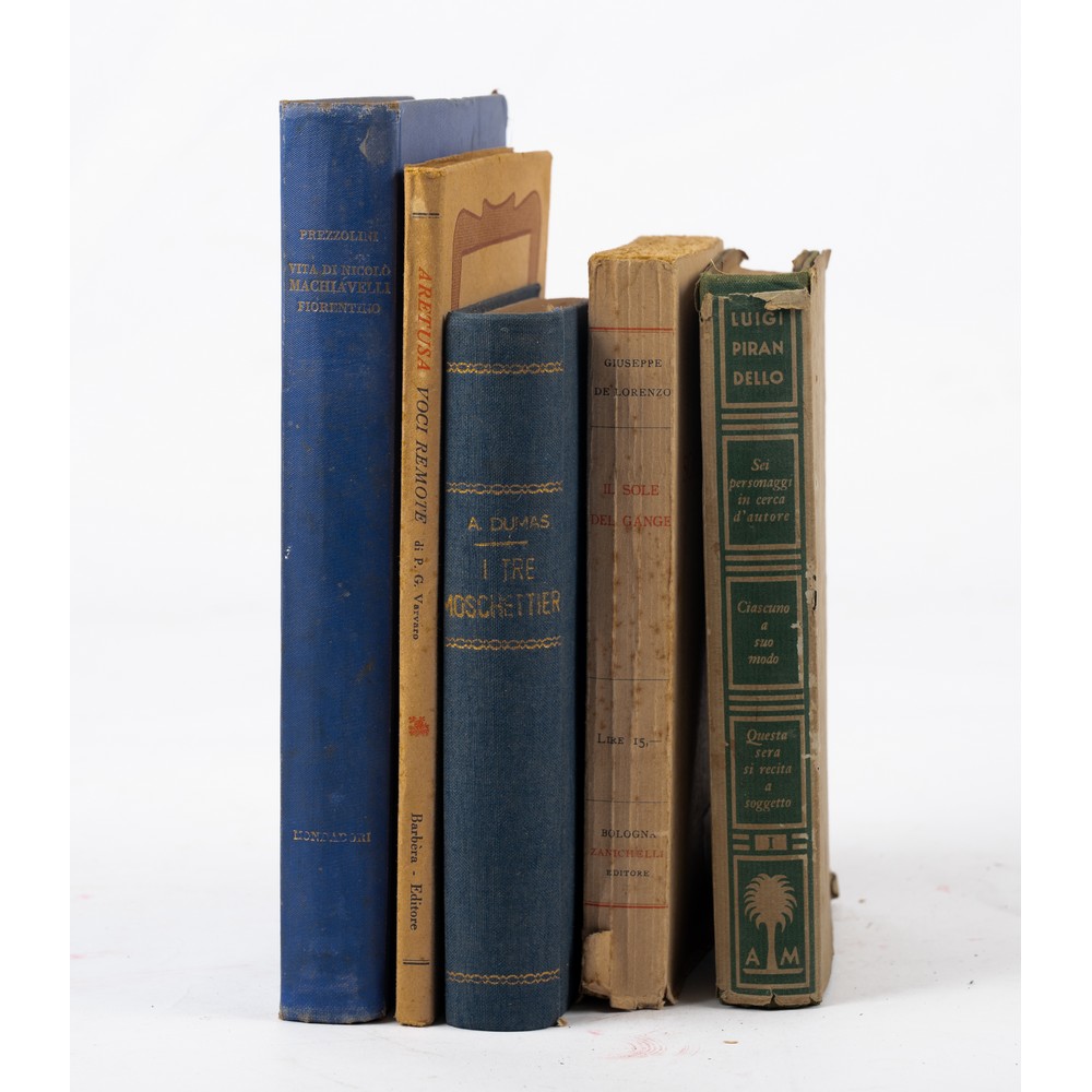 CINQUE VOLUMI DI VARIA DELLA PRIMA META’ DEL XX SECOLO: 1) Luigi Pirandello MASCHERE NUDE, ed. A. Mondadori 1941. Legatura editoriale con sopracoperta editoriale in carta. In discrete condizioni. Pp. XII, 387, (3). 2) Giuseppe De Lorenzo IL SOLE DEL GANGE, ed. Bologna, Zanichelli 1925. In 8°. Brossura editoriale marginosa; tagli marginosi anch’essi. Qualche piccola macchia ma opera in buone condizioni. Pp. 229. 3) Giuseppe Prezzolini VITA DI NICCOLO’ MACHIAVELLI FIORENTINO, ed. Milano, A. Mondadori 1927. In 8°. Legatura editoriale in piena tela rigida con titoli in oro al piatto e al dorso. tagli marginosi. Pp. 254, (4). 4) ARETUSA. VOCI REMOTE DI PIETRO VARVARO, ed. Firenze, G. Barbera 1949. In 8°. Brossura editoriale con ali. Volume in eccellenti condizioni. Pagine ancora intonse. Pp. 81. 5) Alessandro Dumas I TRE MOSCHETTIERI, ed. Lucchi, Milano 1946. In 8° piccolo. Legatura editoriale in piena tela con titoli e fregi impressi in oro al dorso. Volume in più che discrete condizioni. pp. 348, (4).