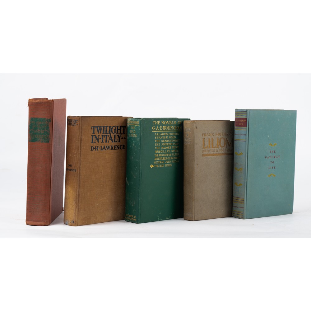 CINQUE VOLUMI DI LETTERATURA E VARIA DEI PRIMI DEL XX SECOLO IN LINGUA INGLESE: 1) Frank Thiess THE GATEWAY TO LIFE, ed. Alfred A. Knopf. NY 1927. In 8°. Legatura editoriale in piena tela rigida con titoli in oro al tassello al dorso. volume in ottime condizioni. Pp. 325, (3). 2) George A. Birmingham THE BAD TIMES, London, Methuen & Co. S. d. ( ma 1912 -1913 circa). In 8°. Legatura editoriale in piena tela rigida con titoli in oro al piatto e al dorso. volume in ottime condizioni. Pp. 288. 3)Franz Molnar LILIOM, ed. Boni and Liveright, NY 1921. In 8°. Legatura editoriale in cartonato rigido con titoli in oro. volume in ottime condizioni. Pp. XIV, (4), 185. 4) Jack Goodman DOG STORIES, ed. Simon and Schuster, NY 1943. In 8°. Legatura editoriale in piena tela rigida con titoli al tassello al dorso. volume in ottime condizioni. Pp. XVI, 591. 5) D. H. Lawrence TWILIGHT IN ITALY, ed. New York, B. W. Huebsch 1916. Legatura editoriale in piena tela rigida con tagli marginosi. Stampato su carta di alta qualità realizzata al torchio. Pp. 312.