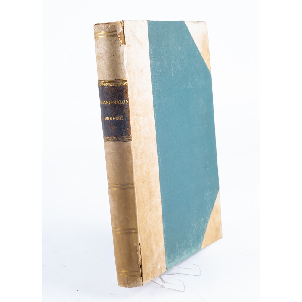 Frederic Masson FIGARO SALON LES BEAUX ARTS EN 1900, ed. Paris, Goupil et cie1900 – 1901. 2 tomi in 1 volume. In folio (36 x 27 cm). Legatura coeva in mezza pergamena rigida con angoli e piatti in percallina verde, con titoli e fregi impressi in oro al tassello al dorso. Brossure originali all’interno. Volume in ottimo stato di conservazione. Stampato su carta patinata. Pp. 72; 72 con numerose riproduzioni in bianco e nero e indici delle incisioni.