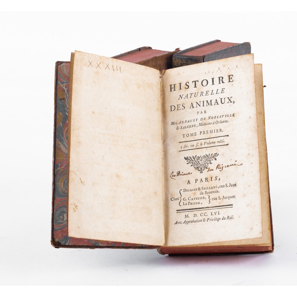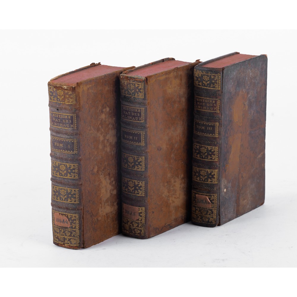 TRE SETTECENTINE DI ARGOMENTO SCIENTIFICO IN LINGUA FRANCESE: Arnault De Nobleville & Salerne HISTOIRE NATURELLE DES ANIMAUX, ed. Paris, Desaint & Saillant MDCCLVI. In 16°. Con belle legature coeve in piena pelle con titoli ai dorsi riccamente fregiati in oro. tagli colorati in rosso. Testatine ed incipit dei capitoli xilografati. Volumi in ottime condizioni. Pp. VI, 651; 347, 318; (2), 604.