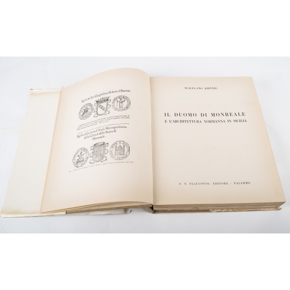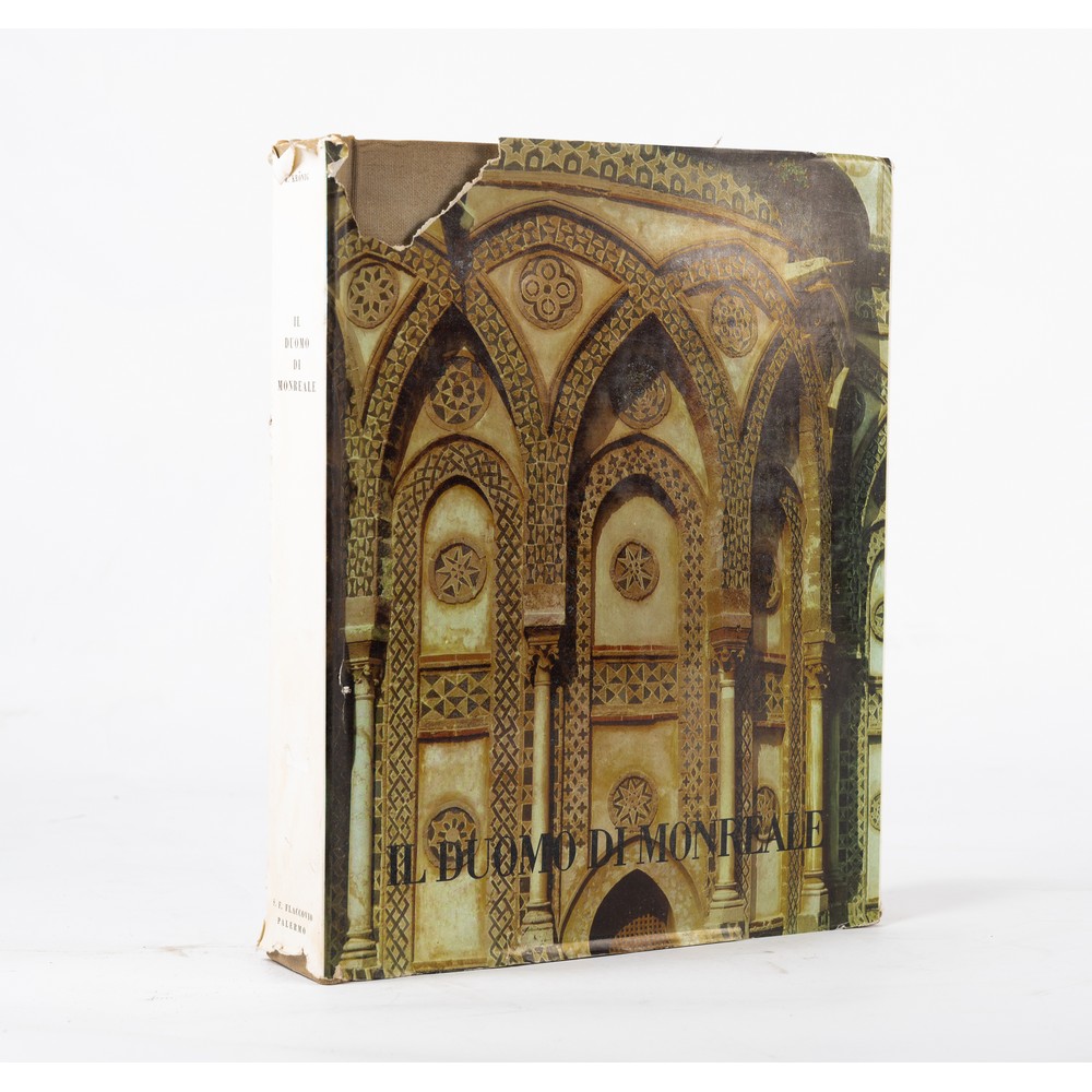 Wolfgang Kronig IL DUOMO DI MONREALE E L'ARCHITETTURA NORMANNA IN SICILIA. In 4° (cm. 35 X 30). Legatura in piena tela editoriale con sovracoperta editoriale illustrata. Qualche sporcizia da esposizione e strappetti alla sopracoerta. Nel complesso in buone condizioni. Questa importante monografia prende in esame l'intero complesso architettonico: Duomo, convento, chiostro e l'ex-Palazzo Reale (attuale seminario arcivescovile), dall'epoca della fondazione (fine del XII secolo) ai nostri giorni. Direzione artistica di Ermanno Gagliardo. Fotografie di Enzo Sellerio. I rilievi del Complesso architettonico sono stati eseguiti da Silvana Braida e Antonio Santamaura. Traduzione di Irene Giorgi-Alberti. Pp. 321, (3), con 47 figure in bianco e nero nel testo, 235 tavole in bianco e nero e 10 a colori fuori testo e 21 tavole, più volte ripiegate, relative a prospetti, piante, facciate, sezioni del complesso monumentale di Monreale.