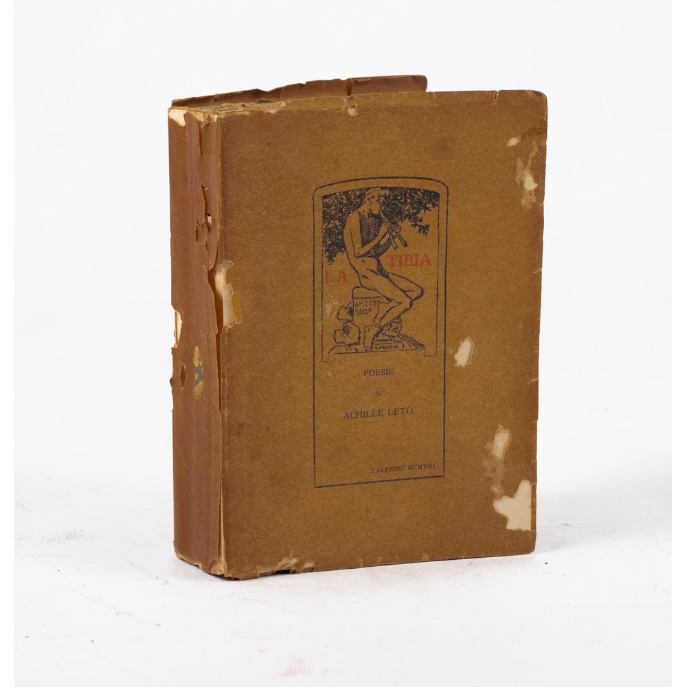 Achille Leto LA TIBIA, POESIE DI ACHILLE LETO, ed. Palermo 1908. In 16°. Volume con dedica autografa dell’autore al poeta monrealese Giuseppe Fedele. Tiratura limitata di 300 esemplari. Brossura editoriale con sopracoperta editoriale pergamenacea figurata. Volume rarissimo a trovarsi.