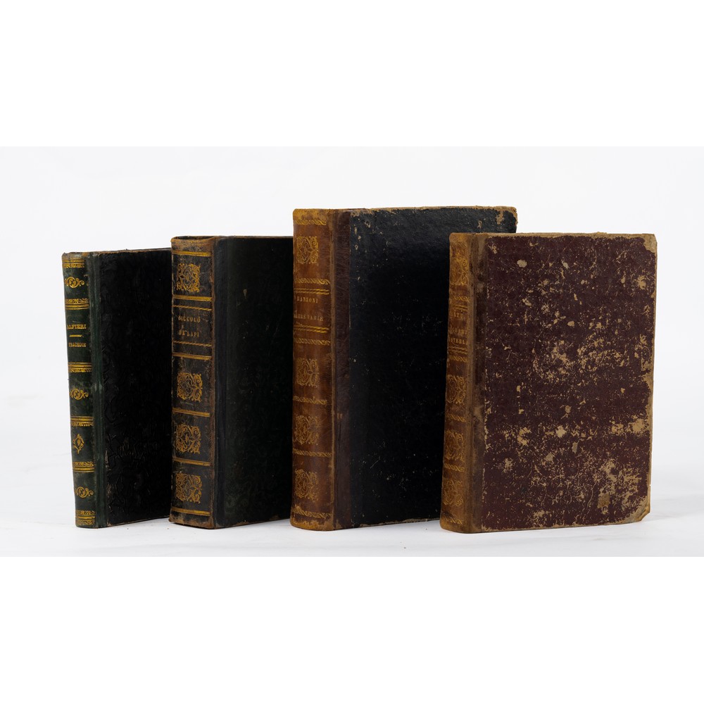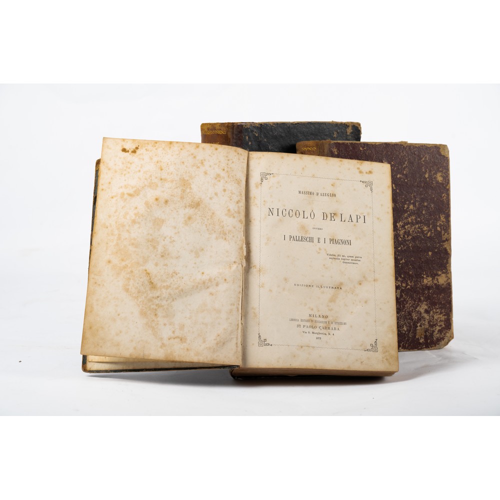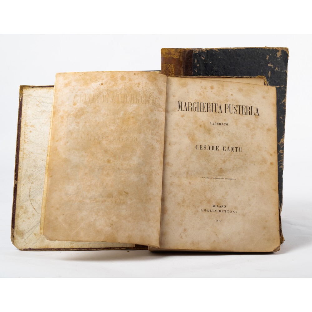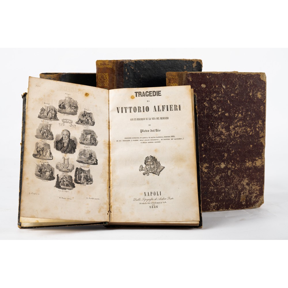 QUATTRO VOLUMI DI LETTERATURA DEL XIX SECOLO: 1) TRAGEDIE DI VITTORIO ALFIERI, ed. Napoli Andrea Testa 1846. In 8°. Legatura coeva in mezza pelle con piatti cartonati e titoli, fregi e filetti impressi in oro al dorso. Bella xilografia in antiporta raffigurante Alfieri e le sue tragedie e incisione xilografica alla pag. 165 raffigurante sempre altre tragedie di Alfieri. Volume con qualche fioritura e qualche leggera brunitura del tempo. Volume in più che discrete condizioni. testo stampato su due colonne. Pp. 423.2) Cesare Cantù MARGHERITA PUSTERLA, ed. Amalia Bettoni, Milano 1870. In 8° grande. Legatura coeva in mezza pelle con piatti cartonati e titoli, fregi e filetti impressi in oro al dorso. Usure d’uso ai piatti. In generale volume in discrete condizioni. vignetta a stampa in antiporta e ritratto xilografico dell’autore. Con illustrazioni nel testo. pp. 532. 3) Massimo D’Azeglio NICCOLO’ DE LAPI OVVERO I PALLESCHI E I PIAGNONI, ed. Milano, Paolo Carrara 1872. Legatura coeva in mezza pelle con piatti cartonati e titoli, fregi e filetti impressi in oro al dorso. In 8° grande. Testo stampato entro cornice. Qualche fioritura e piccole bruniture ma volume in buone condizioni. Pp. 848 con illustrazioni xilografiche f. t. 4) OPERE VARIE DI ALESSANDRO MANZONI, edizione riveduta dall’autore, Milano, Fratelli Richiedei 1870. Il 8° grande. Legatura coeva in mezza pelle, dorso liscio con titoli e filetti in oro. Qualche fioritura e piccole bruniture ma volume in buone condizioni. Cfr. Parenti (Rarità dell'800) pp. 279-281 e Vismara 331. Pp. 955 (1). Con belle incisioni a piena pagina.