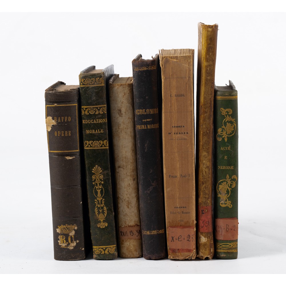 SETTE OTTOCENTINE IN FORMATO 16°: 1) Alessandro Dumas ACTE’ E NERONE, ed. Napoli, Gaetano Nobile 1843. In 16°. Legatura coeva in mezza pelle con piatti marmorizzati e titoli e fregi in oro al dorso. tagli spruzzati. Incipit dei capitoli figurati e finalini. Volume in ottime condizione. Pp. 502. Raro in questa edizione.2) Francesco Soave ISTITUZIONI DI METAFISICA, ed. Napoli, Salvati 1824. In 16°. Legatura coeva in mezza pergamena con piatti marmorizzati. in buone condizioni. Pp. 324.3) Cesare Balbo STORIA D’ITALIA SOTTO AI BARBARI, ed. Firenze, Le Monnier 1856. In 8° piccolo. Brossura editoriale. Tagli irregolari e marginosi. Pagine ancora intonse. Qualche brunitura alle pagine ma volume in buone condizioni. Pp. 498, (1).4) Luigi Galanti GEOGRAFIA ELEMENTARE, ed. Napoli 1850. In 8°. Note m. s. e di possesso. Legatura coeva in piena pergamena rigida. Pp. 144. 5) Caterina Franceschi Ferrucci DELLA EDUCAZIONE MORALE DELLA DONNA ITALIANA, ed. Torino, Gius. Pomba e Comp. 1848. In 16°. Bella legatura coeva in mezza pelle con piatti foderati in seta e titoli e fregi in oro al dorso. Pp. XIX, (1), 409, (3).6) La Marchesa Colombi (Anna Maria Torriani) PRIMA MORIRE, ed. Milano, Galli 1896. In 16°. Legatura coeva in mezza tela con piatti rigidi in pelle e titoli in oro al dorso. volume in ottime condizioni. Pp. 285.7) RACCOLTA COMPLETA DELLE OPERE DI GIORGIO BAFFO, VENETO, ed. Costantinopoli 1860. In 16°. Legatura coeva in piena percallina rigida con titoli, filetti e fregi impressi in oro al dorso. qualche normale usura d’uso, ma volume in ottime condizioni. Pp. 300.