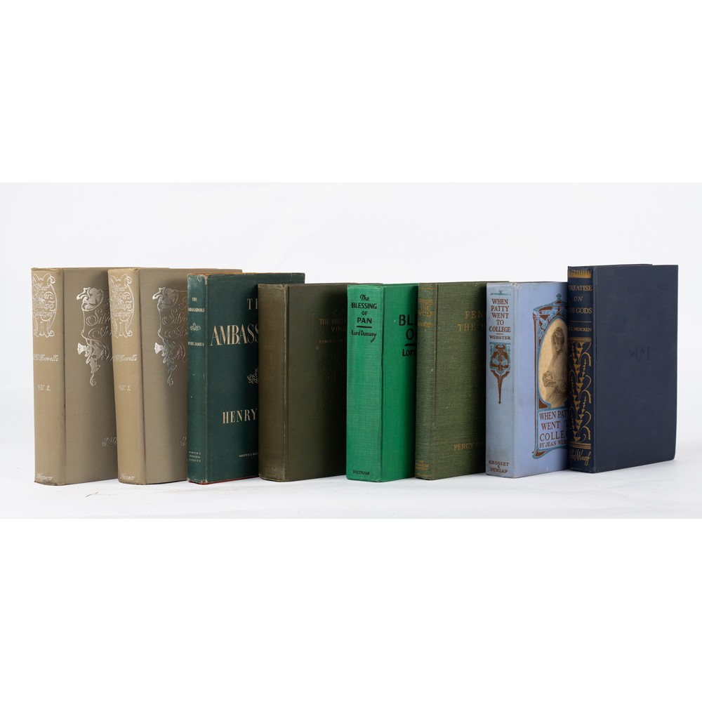 OTTO VOLUMI DI LETTERATURA E VARIA DEI PRIMI DEL XX SECOLO IN LINGUA INGLESE: 1) Robert Hichens THE FRUITFULL VINE, ed. NY, Frederick A. Stokes 1911. Bella legatura editoriale in piena tela rigida con titoli in oro al piatto e al dorso e disegni floreali impressi a secco al piatto e al dorso. in 8°. Volume in ottime condizioni. Pp. 524. 2) Jean Webster WHEN PATTY WENT TO COLLEGE, ed. Grosset and Dunlap, NY 1903. Illustrazioni di C. D. Williams. In 8°. Bella legatura editoriale figurata con applicazione e impressione in oro al piatto e titoli impressi in oro al dorso. volume in ottime condizioni. Pp. (8), 280. 3) Percy Mackaye FENRIS THE WOLF. A TRAGEDY, ed. MacMillan Company, New York, 1905. 1^ edizione. Legatura editoriale in piena tela rigida con titoli in oro al piatto e al dorso. volume in ottime condizioni. Pp. (10), 150. 4) W. D. Howells THEIR SILVER WEDDING JOURNEY, ed. NY, Harper & Brothers 1909. In 2 volumi in 8°. Belle ed eleganti legature in piena tela istoriate in argento ai piatti e ai dorsi. Volumi in perfette condizioni con tagli marginosi e molte pagine ancora intonse. Pp. V, 401; V, 464 con illustrazioni a piena pagina f. t. e vignette n. t. 5) Gustavo Adolfo Becquer LEGENDS, TALES AND POEMS, ed. Ginn and Company, Boston 1907. In 16°. 1^ edizione. Legatura editoriale in piena tela rigida con piccola gora al taglio alto, ma pagine in perfette condizioni. Pp. 288. 6) H. L. Mencken TREATISE ON THE GODS, ed. Alfred A. Knopf, 1930. In 8°. Legatura editoriale in piena tela rigida riccamente fregiato con titoli in oro al dorso. volume in ottime condizioni. Pp. 364, XII. 7) Lord Dunsany THE BLESSING OF PAN, ed. G.P. Putnam’s Sons, NY 1928. In 8°. Legatura editoriale in piena tela rigida con titoli al piatto e al dorso. volume in ottime condizioni. Pp. 277. 8) Henry James THE AMBASSADOR, ed. NY, Harper & Brother 1948. In 8°. Legatura editoriale in piena tela rigida con sopracoperta editoriale con normali usure d’uso, ma volume in perfette condizioni. Pp. 432.