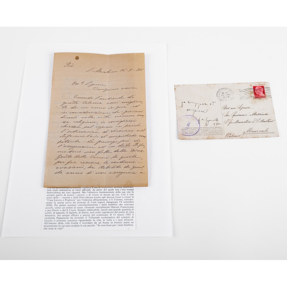 UNA LETTERA ED UNA CARTOLINA AUTOGRAFE relative al palermitano Servo di Dio Padre Giovanni Messina ed al Padre Agostino Gemelli fondatore dell'Università Cattolica del Sacro Cuore di Milano. La prima è una lettera autografa del Servo di Dio, datata 16 Luglio 1915. La seconda è una cartolina a firma del Padre Agostino Gemelli ed inviata a Padre Messina, datata 23 Luglio 1930.
