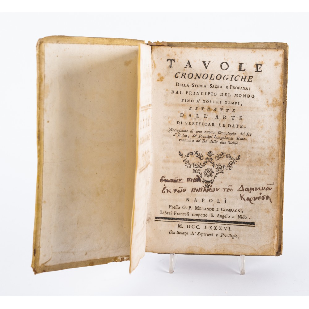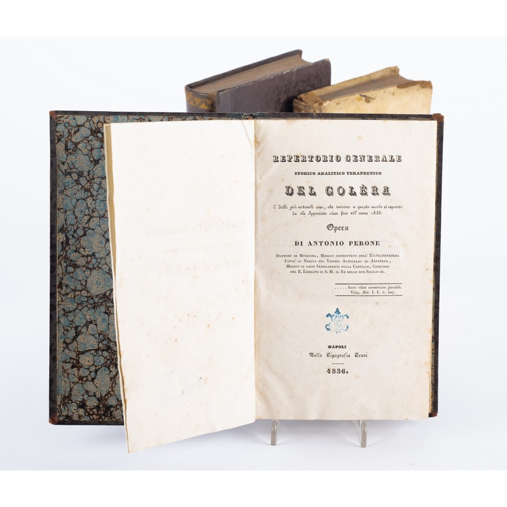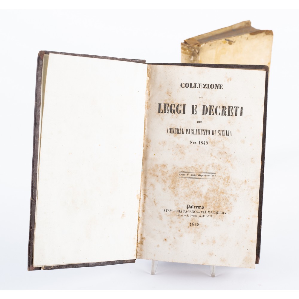 TRE VOLUMI, UNA SETTECENTINA E DUE OTTOCENTINE, IN MISCELLANEA: 1) TAVOLE CRONOLOGICHE DELLA STORIA SACRA E PROFANA … RE DELLE DUE SICILIE, ed. Napoli, Presso G. P. Merande e Compagni 1786. In 8° piccolo. Legatura coeva in piena pergamena rigida con titoli in oro entro tassello oro al dorso. usure ai bordi della coperta e bruniture del tempo. Tagli colorati. Pp. XXIV, 288.2) COLLEZIONE DI LEGGI E DECRETI DEL GENERAL PARLAMENTO DI SICILIA NEL 1848, ed. Palermo, Stamperia Pagano 1848. In 8°. Volume in ottime condizioni. legatura successiva, che racchiude le due parti, in mezza pelle con piatti in percallina rigida e titoli, fregi e filetti impressi in oro al dorso. Raro a trovarsi. Pp. 327, XVII, 253. 2) Antonio Perone REPERTORIO GENERALE STORICO ANALITICO TERAPEUTICO DEL COLERA, ed. Napoli Tipografia Trani 1836. In 8°. Volume in ottime condizioni. Legatura successiva in mezza pelle con piatti in percallina rigida e titoli, fregi e filetti impressi in oro al dorso; tagli spruzzati. Raro a trovarsi. Pp. 347, (4).