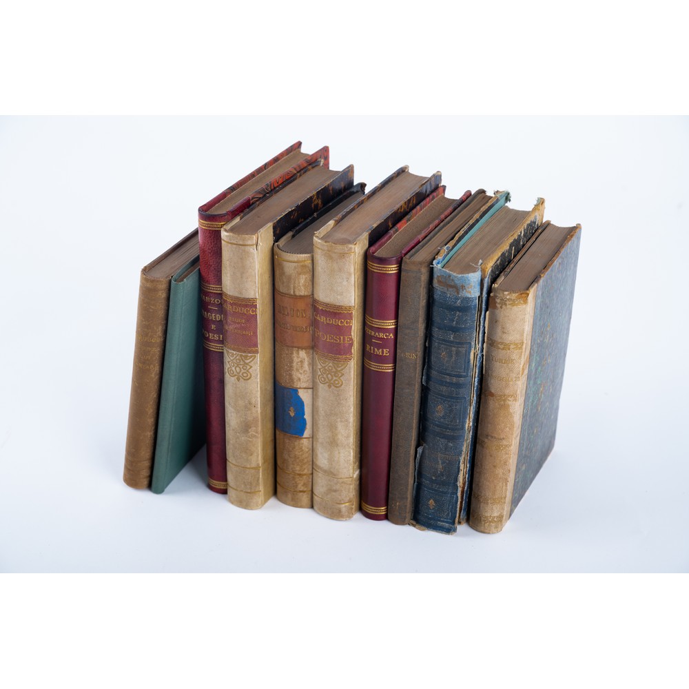DIECI VOLUMI DI LETTERATURA EDITI NEL XIX SECOLO: 1) Giosuè Carducci NUOVE ODI BARBARE, ed. Bologna, Nicola Zanichelli 1882. In 16°. 1^ edizione della seconda serie delle Odi Barbare (la prima è del 1877). Legatura coeva in piena percallina rigida. Frontespizio in rosso e nero con vignette incise poste come testatine e finalini. Esemplare in buone condizioni. L’opera è la più celebre raccolta poetica carducciana, rinverdimento ottocentesco della metrica, appunto, barbara. Accanto alle odi di ispirazione celebrativa e civile, nella raccolta figurano poesie di intonazione più intima e dolente ( vedi: Parenti, Rarità, V, pp. 282-284. Parenti, Prime edizioni, p. 129. F. Salveraglio, n. 135.). Pp. (4), 156, (4). 2) Giovanni De Castro IL GIORNO DI GIUSEPPE PARINI, ed. Milano, Carrara 1890. In 16°. Legatura coeva in piena percallina rigida. Buon esemplare. L’opera fa un ritratto di un’intera classe sociale, per castigarne i comportamenti e i costumi; e il punto di vista è quello del «Precettor d’amabil rito» del “maestro di comportamento e di eleganza”, cioè del maestro del giovane aristocratico, che lo accompagna in ogni attività e che dovrebbe insegnargli come comportarsi. Pp. 161, (6). Raro in questa edizione.3) I SEPOLCRI DI UGO FOSCOLO, ed. Salerno, Vincenzo Stanzone 1890. In 16°. Legatura coeva in piena percallina verde. Buon esemplare. Il carme, in endecasillabi sciolti, esplora l'utilità dei monumenti funerari, partendo da una visione materialistica dell'uomo ma superandola attraverso la funzione civile e affettiva delle tombe e il potere eternatore della poesia. Una delle opere più famose del Foscolo. Pp. 96. Raro in questa edizione. 4) Alessandro Manzoni TRAGEDIE E POESIE, ed. Milano, Fratelli Rechiedei 1886. In 8°. Bella legatura novecentesca, che contiene la brossura originale, in mezza pelle con piatti marmorizzati e titoli, filetti e fregi impressi in oro al dorso. volume in perfette condizioni. Pp. 334, (4). 5) G. Stiavelli e altri – a cura di – LE RIME DI FRANCESCO PETRARCA, ed. Roma, E. Perino 1889. In 16°. Bella legatura novecentesca, che contiene la brossura originale, in mezza pelle con piatti marmorizzati e titoli, filetti e fregi impressi in oro al dorso. volume in perfette condizioni. Pp. 382, (4). 6) Yorick figlio di Yorick ( P. C. Ferrigni) PASSEGGIATE, Firenze, F. Menozzi e C. 1880. Seconda edizione. Volume in 8° piccolo. Legatura coeva in mezza pergamena con piatti marmorizzati e titoli e fregi impressi in oro al dorso. qualche sparsa fioritura ma volume in ottime condizioni. Fin dalla prefazione si possono cogliere gli aspetti peculiari di questo autore, che con tono ironico intende portare il lettore nelle sue passeggiate ad “Asisi” ed in altri luoghi con leggerezza ed allegria. Pp. 201.7) Antonio Bellati – traduzione di – IL PARADISO PERDUTO DI GIOVANNI MILTON, ed. Torino, L’Unione Tipografico Editrice 1856. In 16°. Seconda edizione con la biografia di Milton. Legatura coeva in mezza pergamena con piatti marmorizzati, titoli impressi in oro al tassello al dorso e filetti impressi in oro al dorso. pagine con qualche sparsa fioritura, ma molto ben tenute. Pp. 513, (2). 8) LA GERUSALEMME LIBERATA DI TORQUATO TASSO PRECEDUTA DA UN DISCORSO CRITICO LETTERARIO DI UGO FOSCOLO, ed. Firenze, Felice Le Monnier 1853. In 16°. Quarta edizione. Legatura coeva in mezza percallina con piatti marmorizzati, titoli e fregi impressi in oro al dorso e piatti marmorizzati. qualche usura alle legature del dorso. pagine pulite e ben tenute. Pp. XX, 460.9) POESIE DI GIOSUE’ CARDUCCI ( ENOTRIO ROMANO), ed. Firenze, Felice Le Monnier 1880. In 16° grande. Quarta edizione. Con una biografia del poeta. Legatura coeva in mezza pergamena con piatti marmorizzati, titoli impressi in oro al tassello al dorso e fregi e filetti impressi in oro al dorso. volume in ottime condizioni. Pp. XLIII, 372. 10) STUDI LETTERARI DI GIOSUE’ CARDUCCI, ed. Livorno , Francesco Vigo 1880. In 16° grande. Seconda edizione. Con lo svolgimento della letteratura nazionale, delle rime di Dante, della varia fortuna di Dante, musica e poesia del mondo elegante italiano del secolo XIV. Legatura coeva in mezza pergamena con piatti marmorizzati, titoli impressi in oro al tassello al dorso e fregi e filetti impressi in oro al dorso. volume in ottime condizioni. Pp. 441, (2).