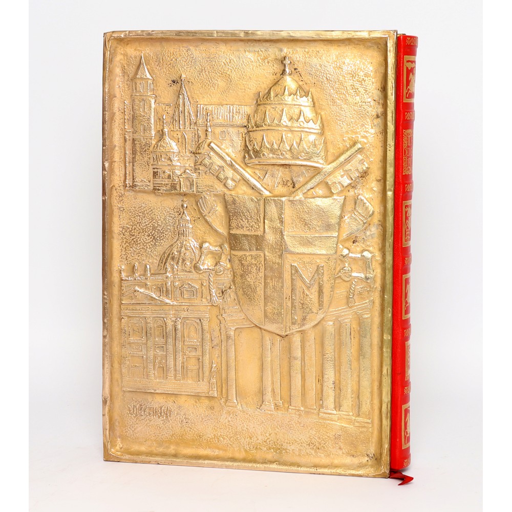 Emilio Cavaterra IL PAPA DEI GIORNI FUTURI, Dino Editori 1981. La vita di Giovanni Paolo II, scritti originali di Emilio Cavaterra. Bassorilievi di Antonio Cocchioni. Edizione speciale ad personam. Legatura in piena pelle con titoli in oro al dorso e tavole lavorate a sbalzo applicate ai piatti. Dimensione: Cm 52x37. Tiratura di 349 esemplari serie Oro firmata dall’editore. La nostra è la n. 144. In perfette condizioni.