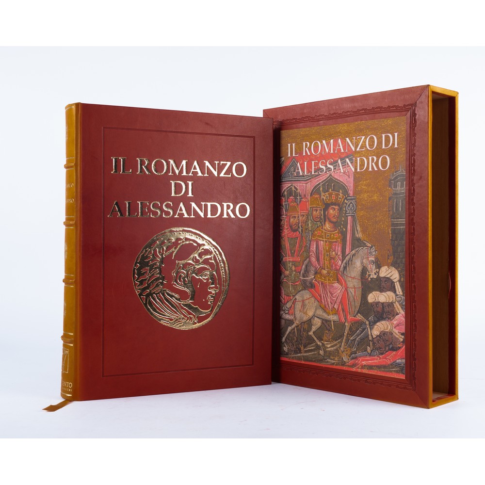 IL ROMANZO DI ALESSANDRO, ed. Officine del Novecento 1999. Volume in folio (cm 46). Legatura editoriale in pelle rossa con impressioni oro al dorso ed al piatto anteriore. Edizione limitata a 1999 copie, la nostra è la n. 408. Opera stampata su carta speciale realizzata dalle cartiere Miliani di Fabriano. Saggi introduttivi a cura di Monica Centanni e Fabrizio Lollini. Il volume è conservato nel suo cofanetto originale rivestito in pelle con decorazioni a secco, illustrato da un'immagine di Alessandro il Grande. Ottimo stato di conservazione. Pp. 272 con un ricco apparato di illustrazioni.