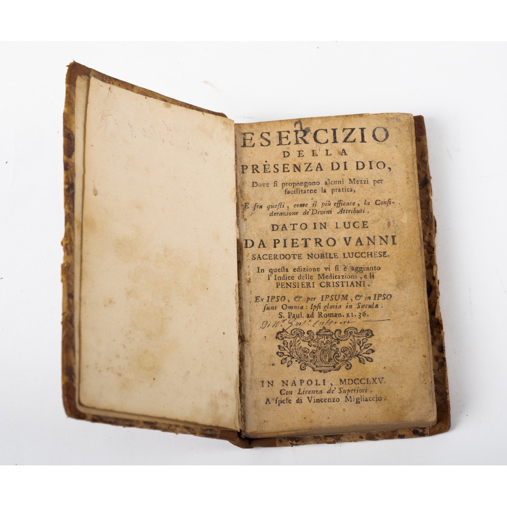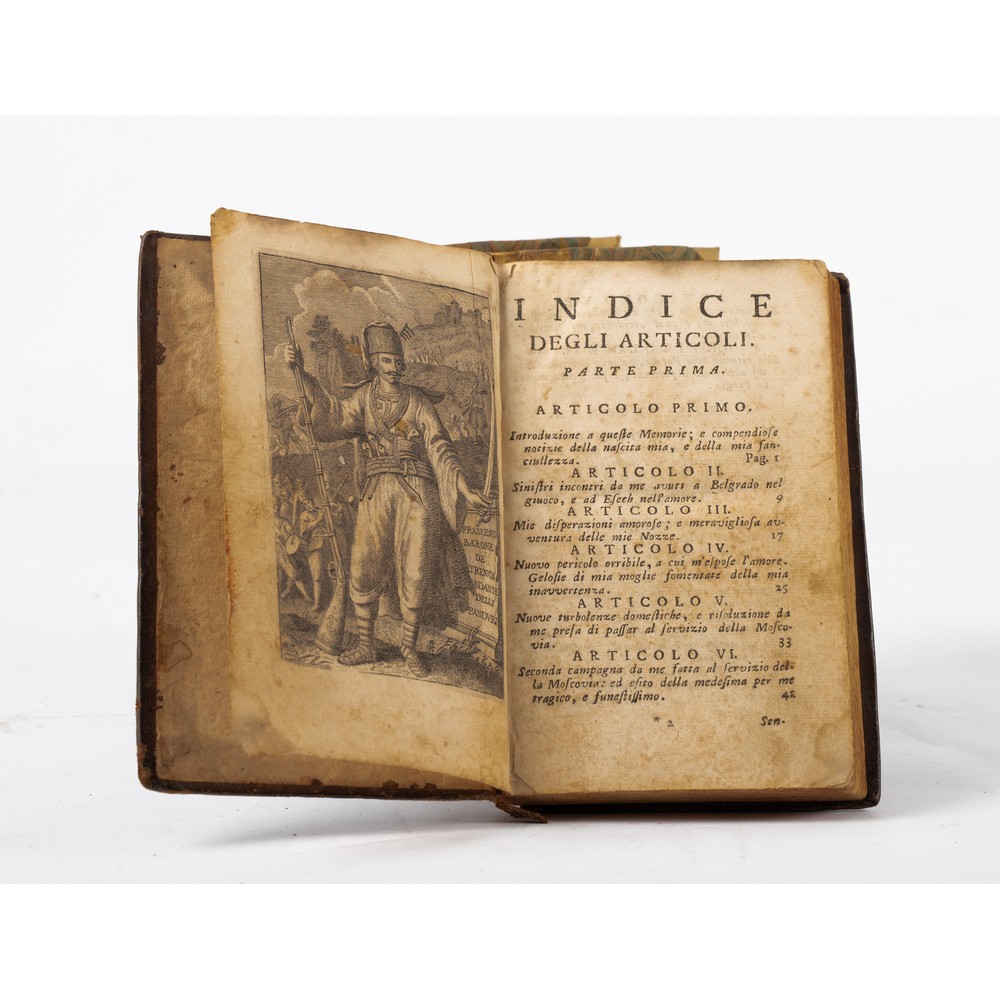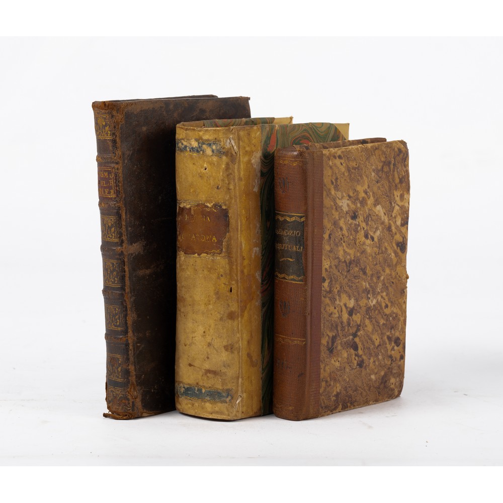 TRE SETTECENTINE DI VARIA: 1) Friedrich von Trenck MEMORIE DEL BARONE DI TRENCK COMANDANTE DE' PANDURI SCRITTE DA LUI MEDESIMO, E DATE IN LUCE DALL'ABATE PIETRO CHIARI, ed. In Helmstat presso Gio. Radick, 1764. Volume mutilo di frontespizio. Presente l’incisione raffigurante il Barone di Trenck in antiporta. In 8° piccolo. Pp. (8), 252, (2 bianche). Note manoscritte di appartenenza. Legatura coeva in piena pelle, con belle nervature al dorso e titoli in oro entro tassello al dorso. fregi in oro al dorso. volume in ottime condizioni con pagine ancora croccanti. 2) Giovanni Margini REGGIA ORATORIA, IN CUI SONO TUTTI I VERBI ITALIANI, ED ALTRI MOLTI VOCABOLI DELL'ULTIMA CRUSCA, CON TUTTI I LORO DIVERSI SIGNIFICATI, In Venezia MDCCXXIX Nella Stamperia Baglioni. In 16°. Legatura ottocentesca in mezza pergamena con angoli e piatti marmorizzati. titoli in oro entro tassello al dorso. stampato su due colonne. Fioriture e qualche macchiolina sparsa ma volume in ottime condizioni. Piccolo segno di tarlo, ormai debellato, in ultima pagina. Pp. 734. 3) Pietro Vanni ESERCIZIO DELLA PRESENZA DI DIO, ed. In Napoli MDCCLXV a spese di Vincenzo Migliaccio. In 16°. Note manoscritte di appartenenza. Legatura ottocentesca in mezza pelle con angoli e piatti marmorizzati; titoli in oro entro tassello al dorso. fregi impressi a secco al dorso. volume in più che discrete condizioni. Pp. 253, (12) di indice.