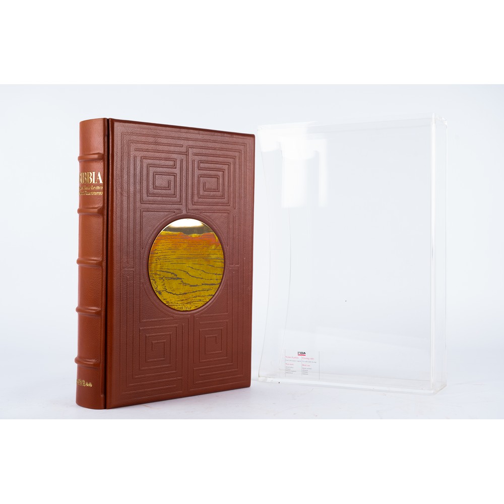 BIBBIA. GENESI, ESODO, LEVITICO, NUMERI, DEUTERONOMIO, ed. FMR/Livres de Peintres 2008. L'opera comprende un saggio introduttivo di Frédéric Manns, già direttore dello Studium Biblicum Franciscanum di Gerusalemme; i primi cinque Libri della Bibbia (Genesi, Esodo, Levitico, Numeri, Deuteronomio) nella versione ufficiale curata dalla Conferenza Episcopale Italiana; otto tavole a colori fuori testo, realizzate appositamente per questa edizione dal maestro Leonardo Cremonini. Cm. 28 x 42,5, pp. 352. Con tavole serigrafiche a colori fuori testo di Leonardo Cremonini. Sontuosa legatura in piena pelle naturale, tinta alla botte, con fregi ed iscrizioni in oro a caldo. In copertina litoserigrafia materica su lastra di ottone dorato sempre del maestro. Entro custodia originale in plexiglass. Edizione di pregio stampata in 925 esemplari numerati, il nostro è il n. 139.