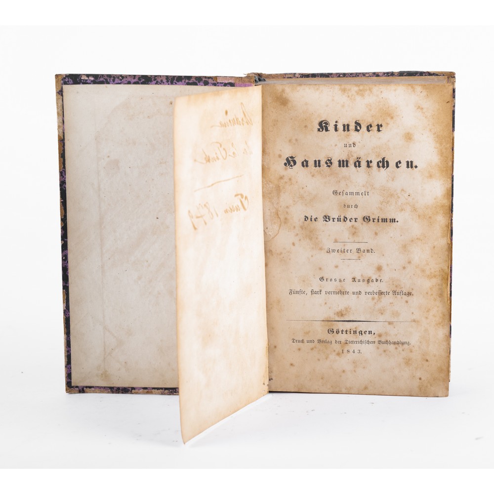 Grimm (Brüder), Jakob und Wilhelm KINDER UND HAUSMÄRCHEN. GESAMMELT DURCH DIE BRÜDER GRIMM. GROSSE AUSGABE, ed. Göttingen, Druck und Verlag der Dieterichschen Buchhandlung, 1843. In 16° grande. Pp. VI, 523. Questa edizione non è presente in Seebaß e Göbels; prima edizione di questa raccolta notevolmente ampliata delle fiabe dei fratelli Jakob e Wilhelm Grimm ancora in vita. Molto ben conservata e di grande rarità. In questa raccolta ampliata dai Grimm di circa 50 fiabe si trova per la prima volta una delle fiabe più famose, ovvero la n. 187 “Il coniglio e il riccio”, che in precedenza era stata pubblicata solo nel 1840, in basso tedesco nell'Hannoverschen Volksblatt di Wilhelm Schröder, citato dal catalogo della SBB Sign. BIV 1 b, 665 R. Ex Libris m. s. sul foglio di guardia. Lingua: tedesco. Rilegatura coeva in mezza percallina con piatti marmorizzati. Quinta edizione, notevolmente ampliata e migliorata. Secondo volume.