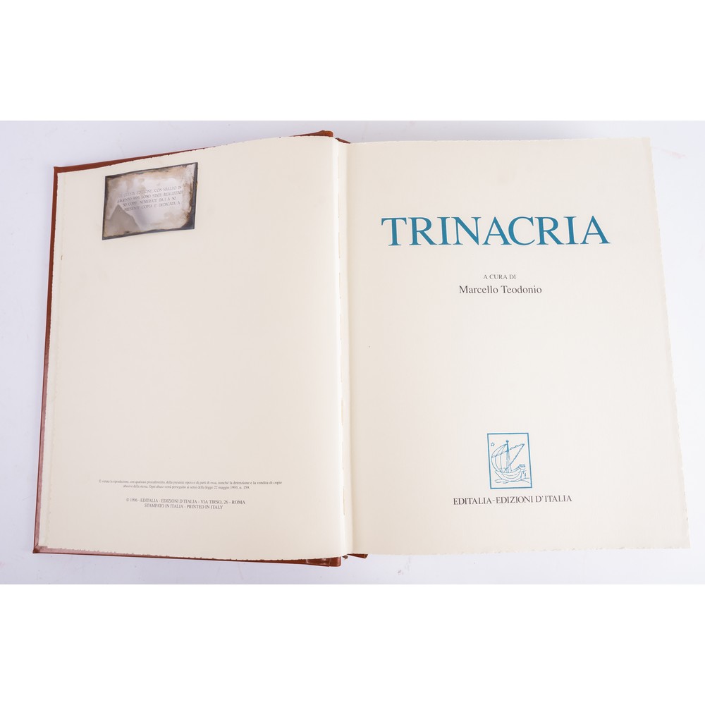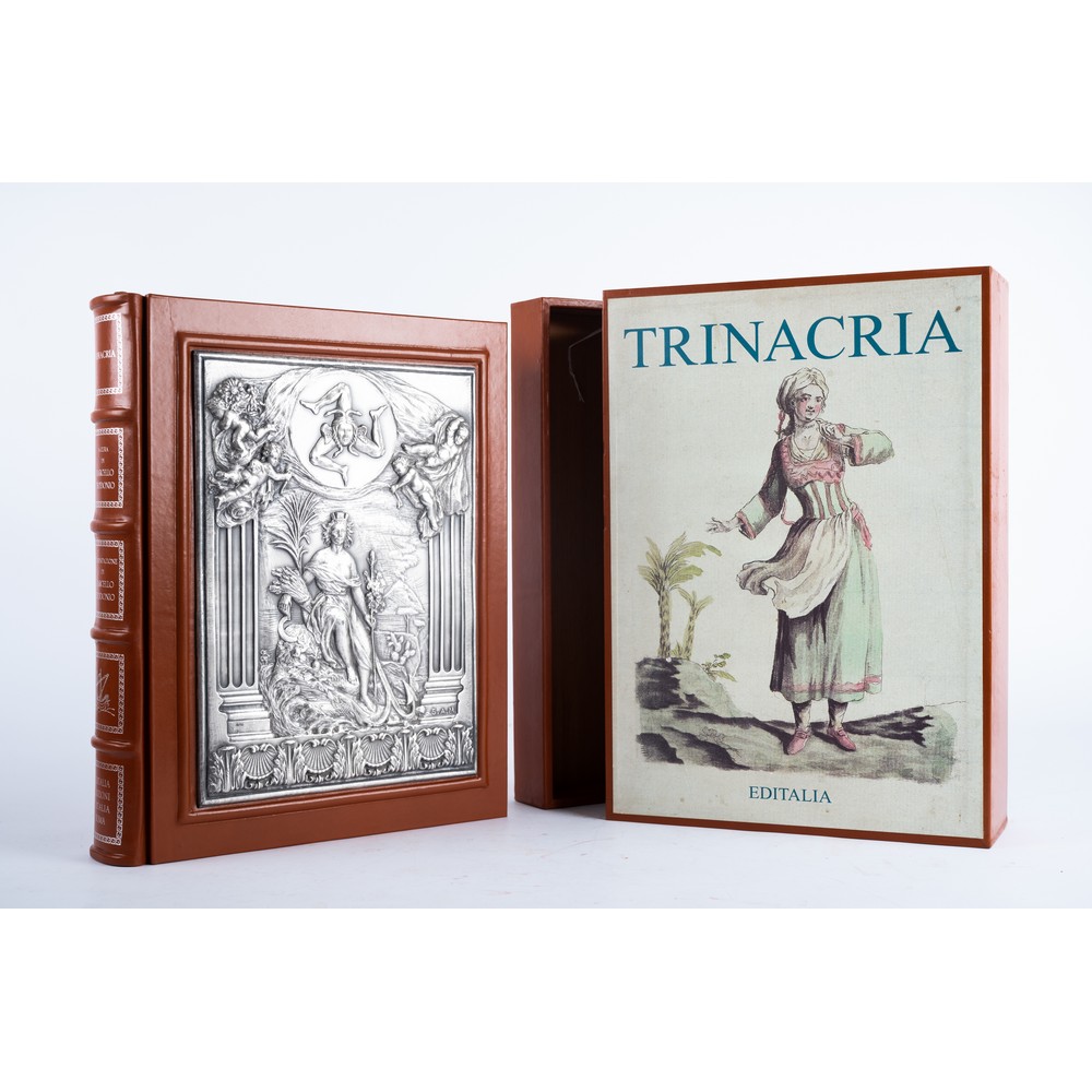 Marcello Teodino - a cura e introduzione di – TRINACRIA, ed. Editalia 1996. In folio – volume lussuosamente realizzato contenuto entro il cofanetto artistico a bauletto in legno rivestito in pelle e illustrazioni in carta applicate. Esemplare a tiratura limitata di 50 esemplari. Il nostro è il n. 19, con certificato di autenticità. Esemplare allo stato di nuovo. Legatura interamente artigianale in pelle di vitello, cucitura a mano, con concia vegetale al sego, tamponata a mano all’ anilina. Legatura con piatti in legno rivestiti in pieno vitello, borchie di protezione al piatto posteriore e nervature e titoli impressi in argento al dorso. Goffrature a secco ai tagli. Segnalibro originale in pelle. Il volume traccia una storia della cultura letteraria siciliana dal XIII al XIX. Il bassorilievo in argento 999 (cm. 24x33) è eseguito dalla Zecca di Stato da bozzetto originale di Marco Saliola della Scuola dell’ Arte della Medaglia, tirato in 50 esemplari numerati da 1 a 50 ogni esemplare è marcato con punzone dell I.P.Z.S. E' raffigurata una figura femminile al centro della composizione, ripresa da una litografia ottocentesca, è la Personificazione della Sicilia che reca con sé elementi simbolici della natura e della cultura dell’Isola. La ricca composizione che fa da cornice è liberamente ispirata agli stucchi che decorano l’oratorio della Confraternita di San Lorenzo di Palermo, opera dello scultore barocco Giacomo Serpotta (seconda metà del XVI secolo). Al centro, in alto, campeggia la Trinacria. Pp.280, con oltre 150 illustrazioni in bianco e nero e a colori. Opera allo stato di nuovo.