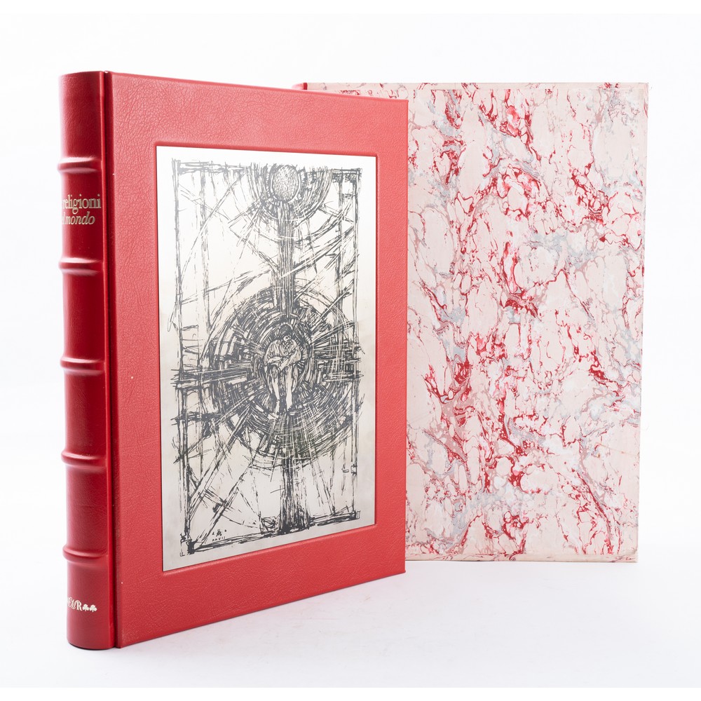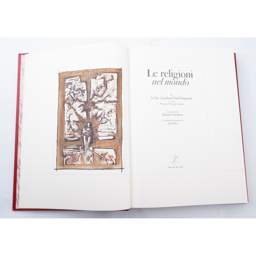 Paul Poupard / Pasquale Iacobone LE RELIGIONI NEL MONDO, ed. FMR / Art’è 2008. Collezione Ars Sacra. Introduzione del Cardinale Paul Poupard, Presidente emerito del Pontificio Consiglio della Cultura e del Pontificio Consiglio per il Dialogo Interreligioso. In formato atlantico. Imponente legatura in tessuto speciale FMR, tinta alla botte in colore rosso, con titoli in oro bianco al dorso e realizzata artigianalmente presso la legatoria "L’Arte del Libro" di Bruno Superti in Todi. La stampa dei testi, composti con i caratteri bodoniani tondi e corsivi nei corpi 21, 17 e 10, è stata eseguita in Milano presso la stamperia di Jacopo Steffenini su carta velata in puro cotone da 170 grammi, creata appositamente per questa edizione e impreziosita dalla filigrana con il logo della collezione "Ars Sacra", fabbricata manualmente su telaio alla forma tonda con particolare formula esclusiva dalle Cartiere Magnani in Pescia. Sulla copertina del volume è presente una un’incisione a lastra applicata a mano, raffigurante “Ricerca della Verità” Studio 5 di Ugo Riva, realizzata a mano. Il volume reca le firme dell’artista e dell’editore in corrispondenza del colophon descrittivo ed è contenuto in un elegante cofanetto in cartone rigido marmorizzato. L'edizione è corredata da un disegno del maestro Ugo Riva, posto nell'antiporta del volume, e da 153 immagini a colori fuori testo elaborate in fotolitografia da Modesto Rigoldi in Milano e stampate in Milano presso la stamperia di Jacopo Steffenini, figlio di Giampaolo, su carta patinata opaca da g.170, prodotta dalle Cartiere del Garda di Riva del Garda. L'opera è in tiratura limitata di 1875 esemplari numerati a mano a cifre arabe, il nostro è l'esemplare n° 1217/1875. Piano dell'Opera: Capitolo 1: "Alla scoperta delle religioni"; Capitolo 2: "L’“homo religiosus"; Capitolo 3: "Religioni antiche"; Capitolo 4: "Religioni d’Asia, Africa, Australia"; Capitolo 5: "La posterità di Abramo"; Conclusione: Salvezza dell’uomo e avvenire della religione; Le religioni e le arti. Note alle immagini di F.Gualdoni. L’opera del Cardinale Paul Poupard, curata da Monsignor Pasquale Iacobone, rappresenta una traccia per un ragionamento a tutto campo, in senso storico e in senso geografico, sull’idea stessa di arte sacra. Un viaggio entro le ragioni diverse delle religioni dell’umanità, dalla Grande Madre ai grandi monoteismi, dalla sapienza occidentale a quella orientale, un viaggio nell’idea stessa di arte e di storia dell’arte. Il primo esemplare dell’edizione è riservato a Papa Benedetto XVI. Pp. 396. Stato di nuovo.