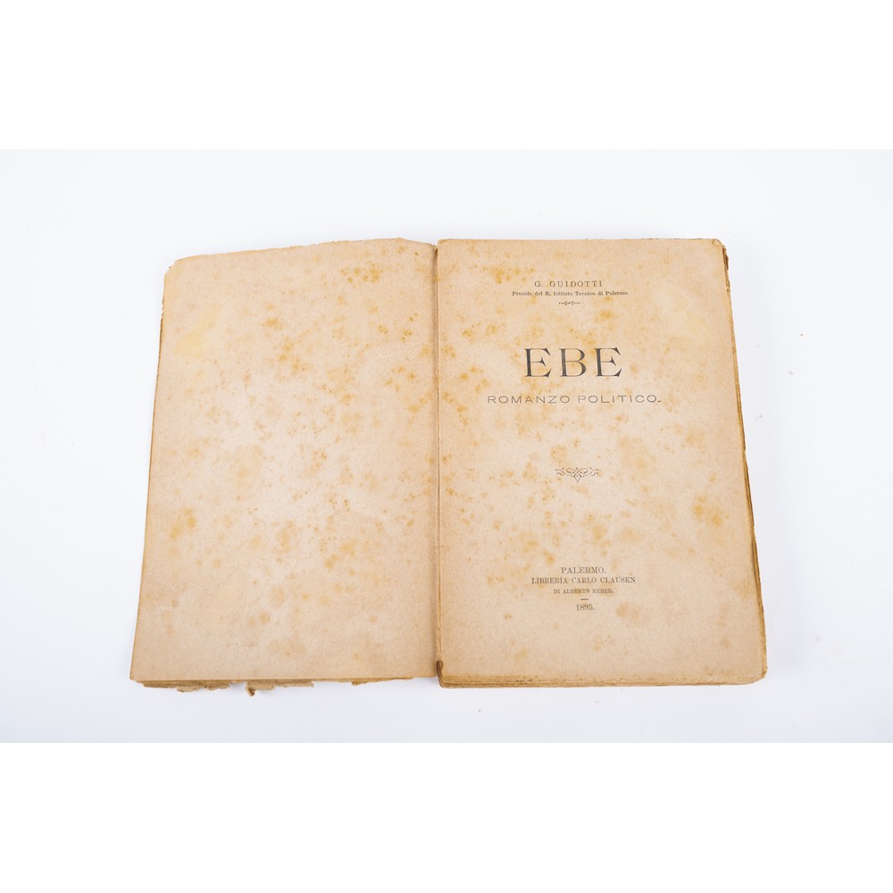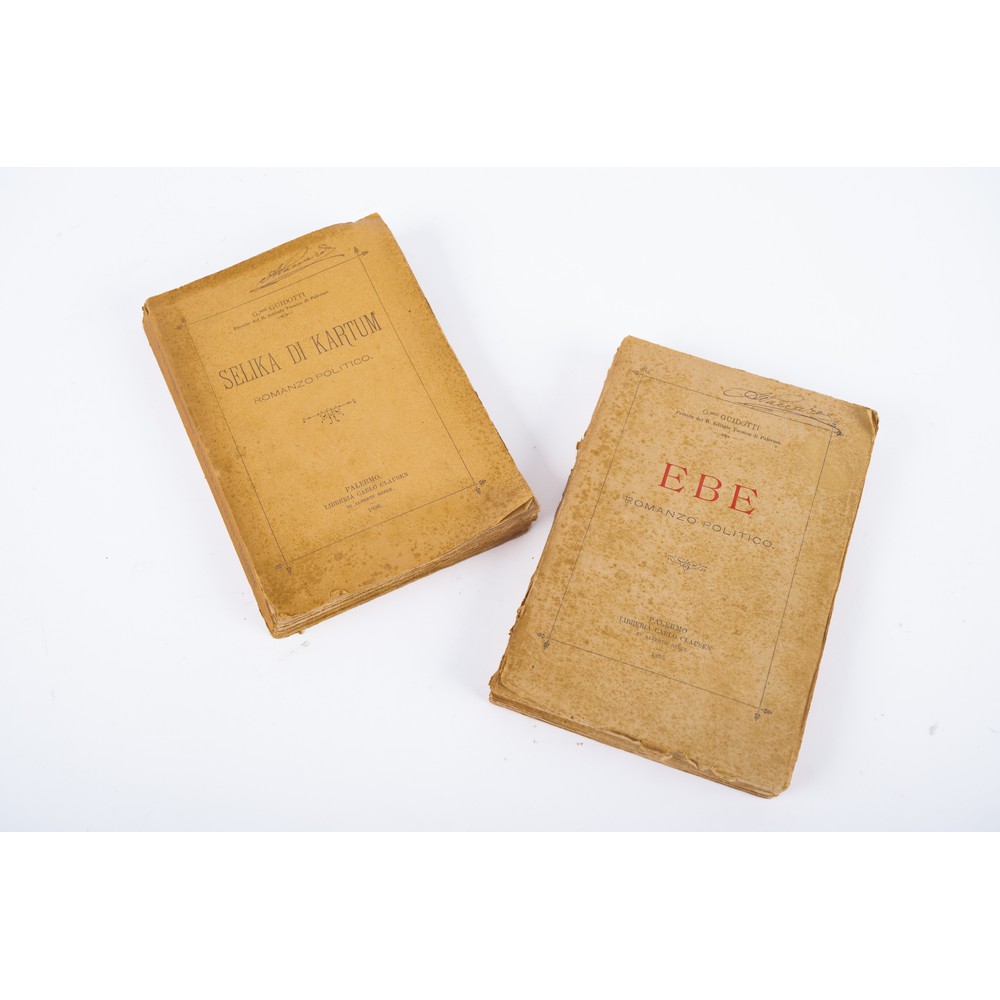 DUE RARISSIMI VOLUMI di Giovanni Guidotti: 1) EBE. ROMANZO POLITICO, ed. Palermo, Carlo Clausen 1895. In 8° piccolo. Brossura editoriale marginosa. Fioriture sparse ma volume in più che discrete condizioni. pp. 254.2) SELIKA DI KARTUM. ROMANZO POLITICO, ed. Palermo, Carlo Clausen 1896. In 8° piccolo. Brossura editoriale e tagli marginosi. Fioriture sparse ma volume in più che discrete condizioni. pp. 254.