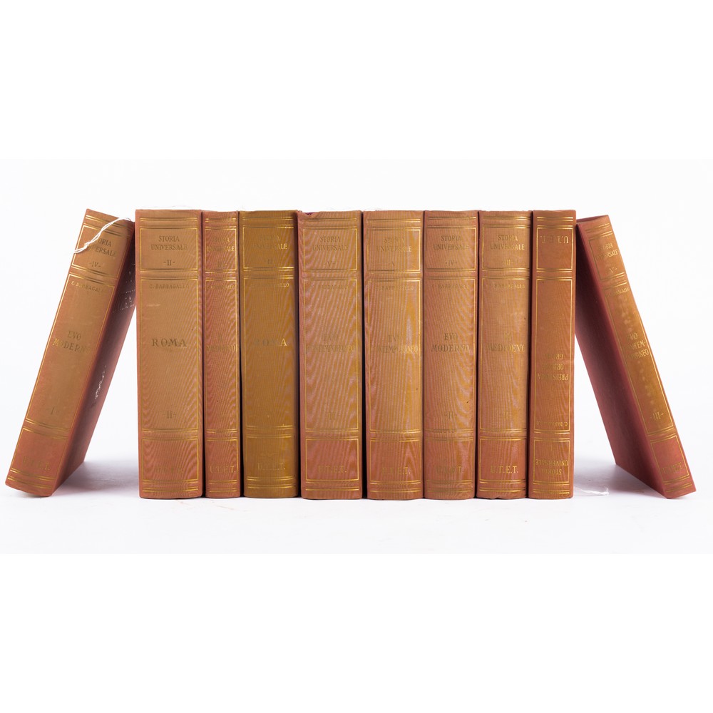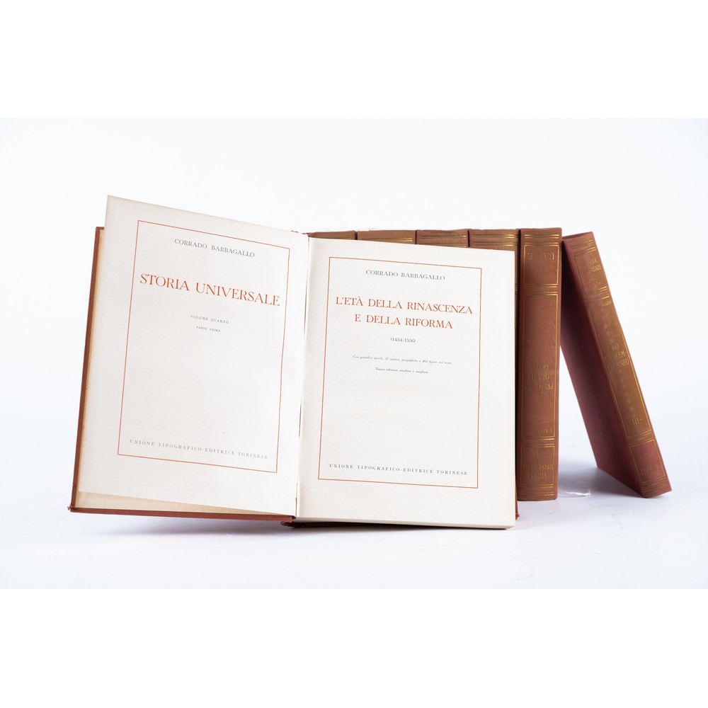 DIECI VOLUMI DI STORIA: Corrado Barbgallo STORIA UNIVERSALE, ed. UTET 1950 – 1954. Dieci volumi in 8°. Legatura editoriale in piena tela con titoli impressi in oro ai piatti e ai dorsi. Opera completa in 10, in ottimo stato con pagine integre e pulite, con tavole fuori testo illustrazioni e cartine. Piano dell’opera: 1: Preistoria, Oriente, Grecia (... IV sec. a C.). - 1950. - XV, 574 p. : con [10] tavole, 19 cartine storico-geografiche e 225 figure nel testo; 2.1: Roma antica : dalle origini alla fine della Repubblica (VIII sec. a C. 49 d. C.). - 1951. - XIV, 823 p. : con [9] tavole e 1 cartina a colori fuori testo, 42 cartine geografiche e 295 figure nel testo; 2.2: Roma antica: l'Impero (49 a C. 476 d. C.). - 1952. - XII, [825]-1721 p. : con 1 carta storico-geografica e [12] tavole fuori testo, 7 cartine geografiche e 484 figure nel testo; 3.1: Il Medioevo (476-Sec. 11). - 1950.- VIII, 467 p. : con [4] tavole, 20 cartine geografiche e 364 figure nel testo; 3.2: Il Medioevo (Sec. 11.-1454). - 1950. - VIII, [469]-1218 p. : con [8] tavole, 20 cartine geografiche e 462 figure nel testo; 4.1: L'età della Rinascenza e della Riforma (1454-1556). - 1950. - XII, 680 p.: con [15] tavole, 17 cartine geografiche e 463 figure nel testo; 4.2: Controriforma e prerivoluzione (1556-1699). - 1950. - VIII, [681]-1368 p. : con [11] tavole, 14 cartine geografiche e 360 figure nel testo; 5.1: Riforme e rivoluzioni (1699-1799). - 1951. - XVI, 794 p. : con [11] tavole, 13 cartine geografiche e 455 figure nel testo; 5.2: Dall'età Napoleonica alla fine della prima guerra mondiale (1799-1919). -1953. - XII, [795]-1678 p. : con [14] tavole, 36 cartine geografiche e 570 figure nel testo; 5.3: Dalla fine della prima guerra mondiale allo scoppio della seconda (1919-1939) /note bibliografiche a cura di Gino Luzzatto. - 1954. - XII, 361 p. : con 12 tavole e 280 figure nel testo.