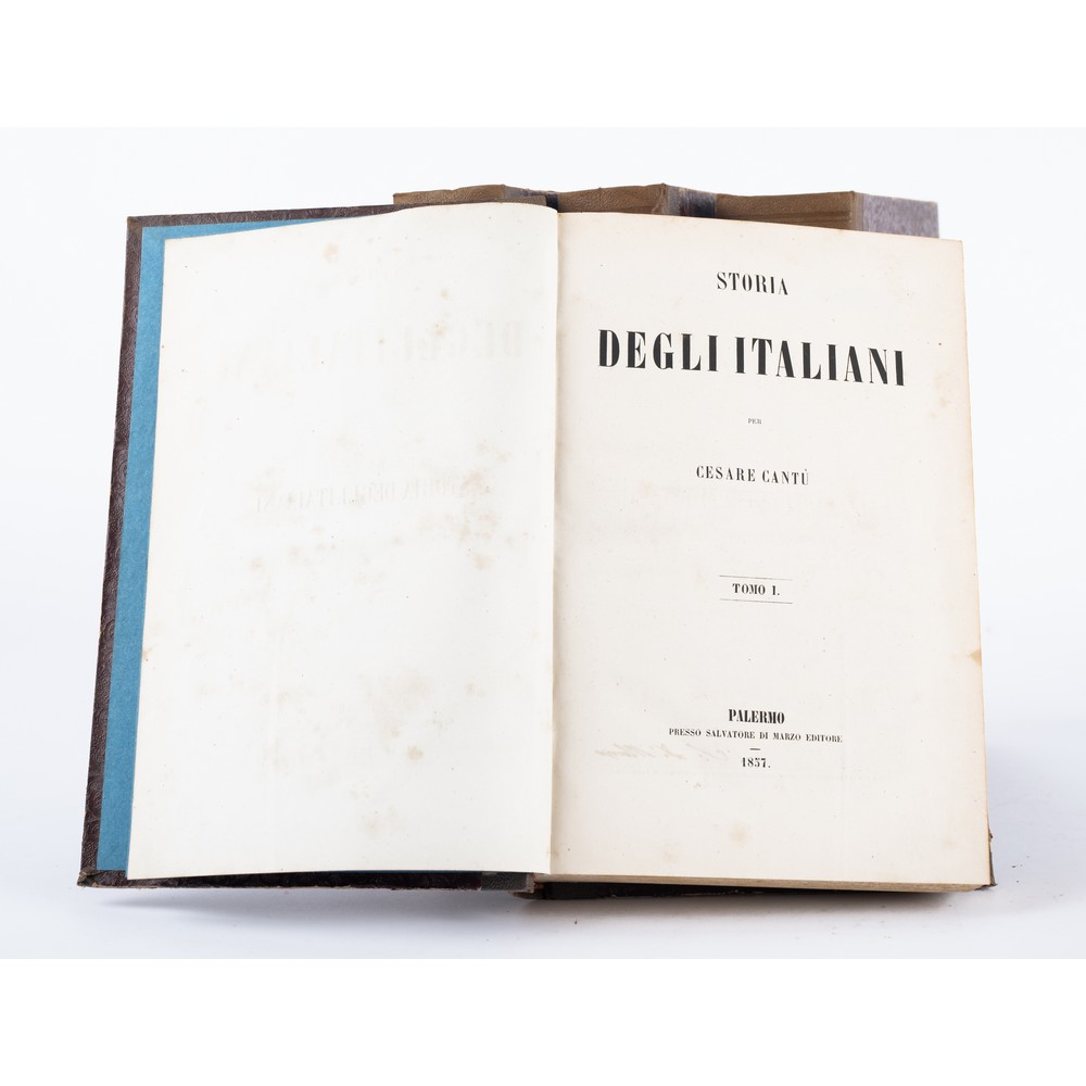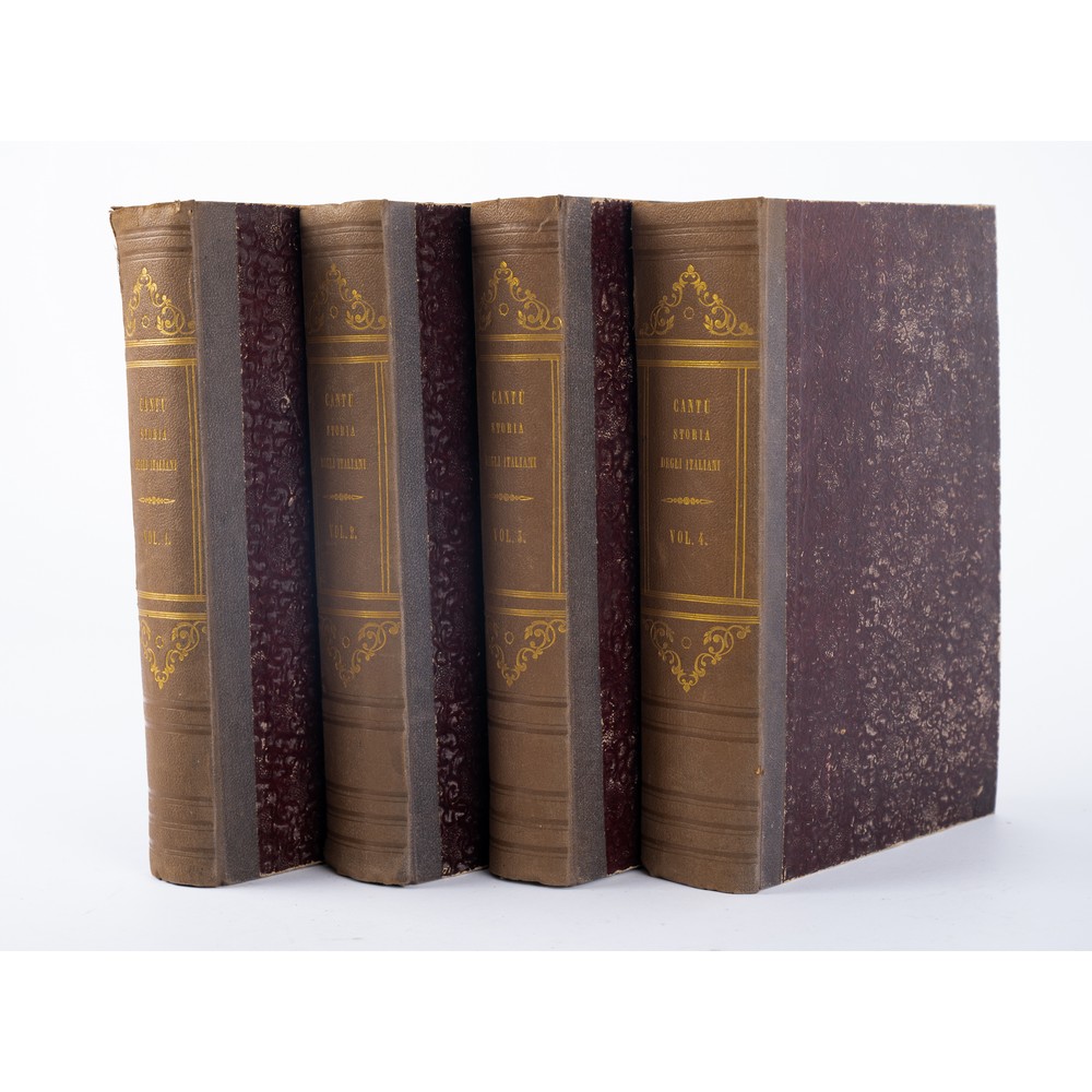 QUATTRO VOLUMI DI STORIA: Cesare Cantù STORIA DEGLI ITALIANI, ed. Palermo Salvatore Di Marzo 1857. 4 volumi in 8° grande. Legature coeve in mezza percallina e piatti cartonati floreali. Titoli e fregi in oro impressi ai dorsi. Pp. 704, (2); 753, (2); 737, (2); 1020, (2). Volumi in ottime condizioni.